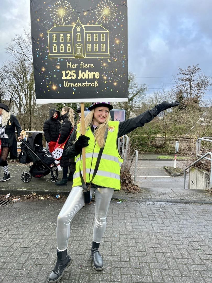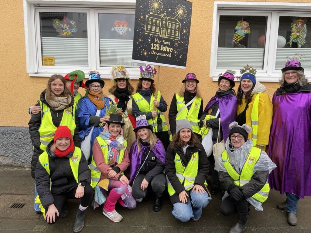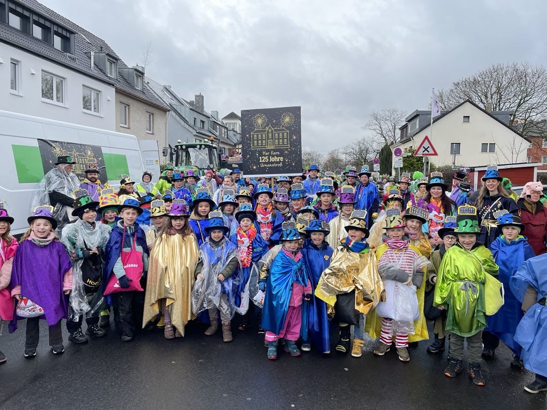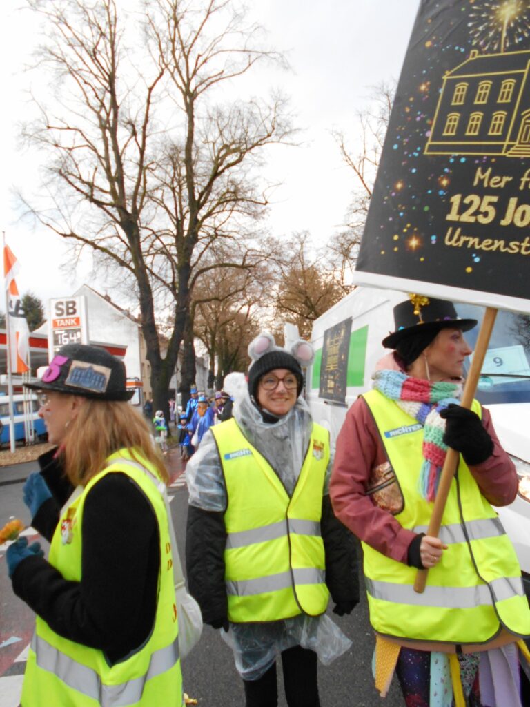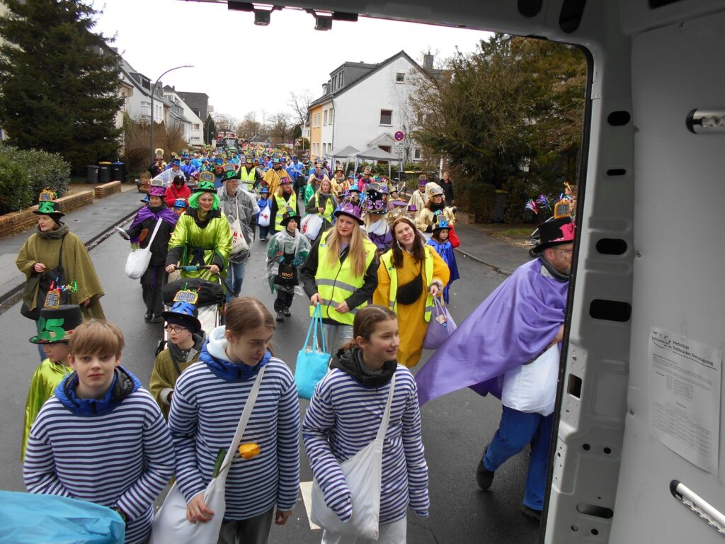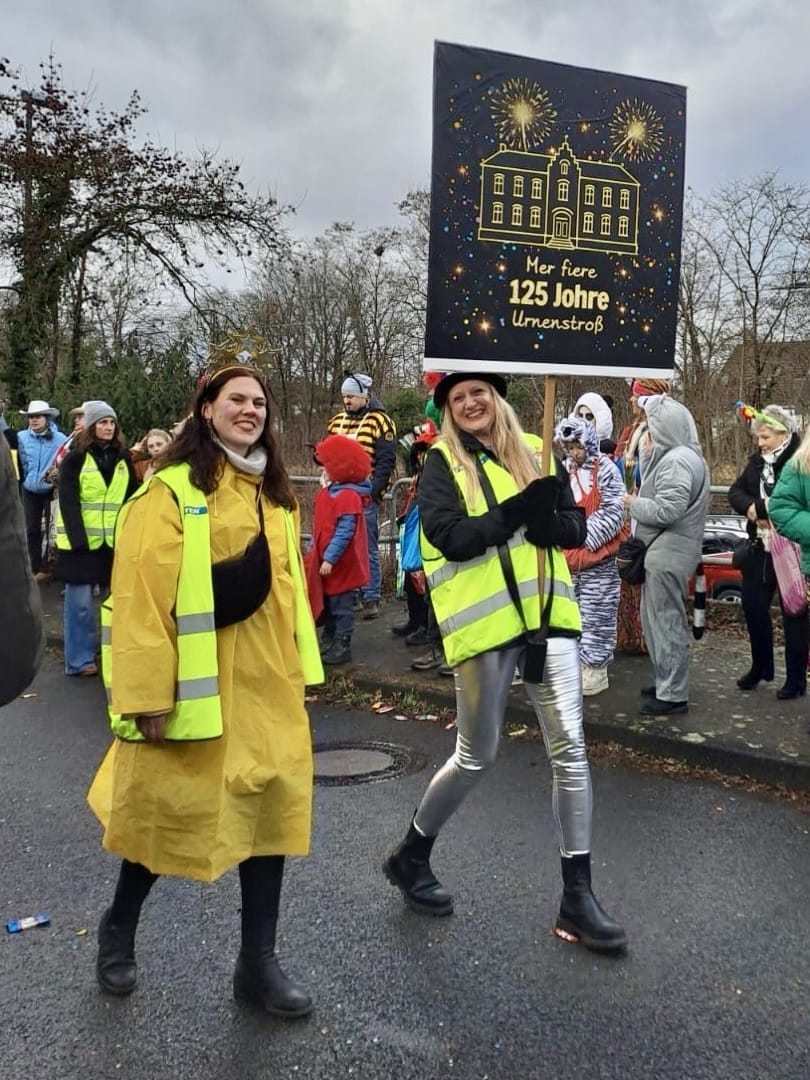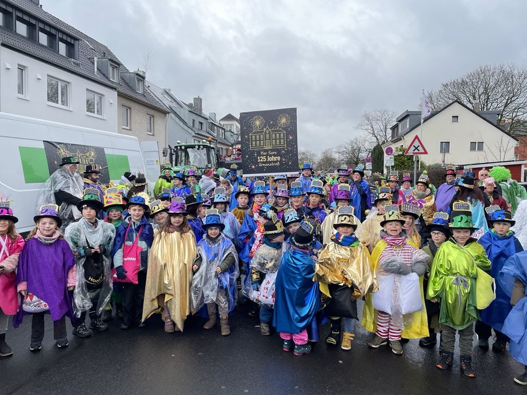 Am Baggagewagen holen sich Mütter und Väter, Kinder und Großeltern die Beutel während des Zugs ab. Drei Ehemalige helfen als Kamelleläufer aus, halten Jutebeutel auf beim Umfüllen der Tüten, transportieren Nachschub durch die Reihen. Vorbei an den Jecken in den metallicfarbenen Ponchos, die lila, blau, grün oder golden glänzen. Dazu haben sich die Teilnehmenden Zylinder gebastelt, auf denen das Motto der Gruppe abgebildet ist: „Mer fiere 125 Johre Urnenstroß“. Mit einem Bild des denkmalgeschützten Schulgebäudes am Standort Urnenstraße, der 125 und bunten Glitzercocktailschirmchen.