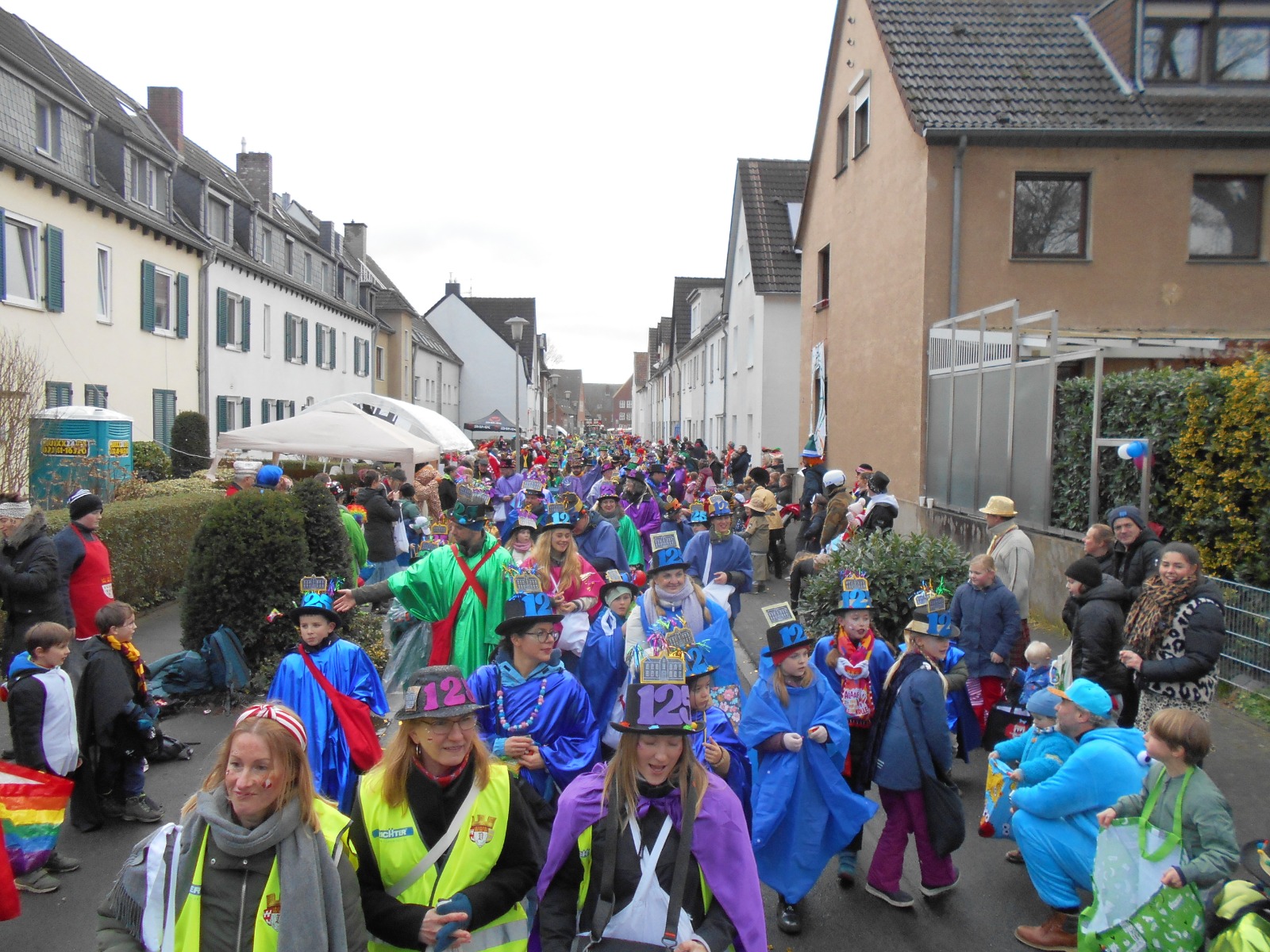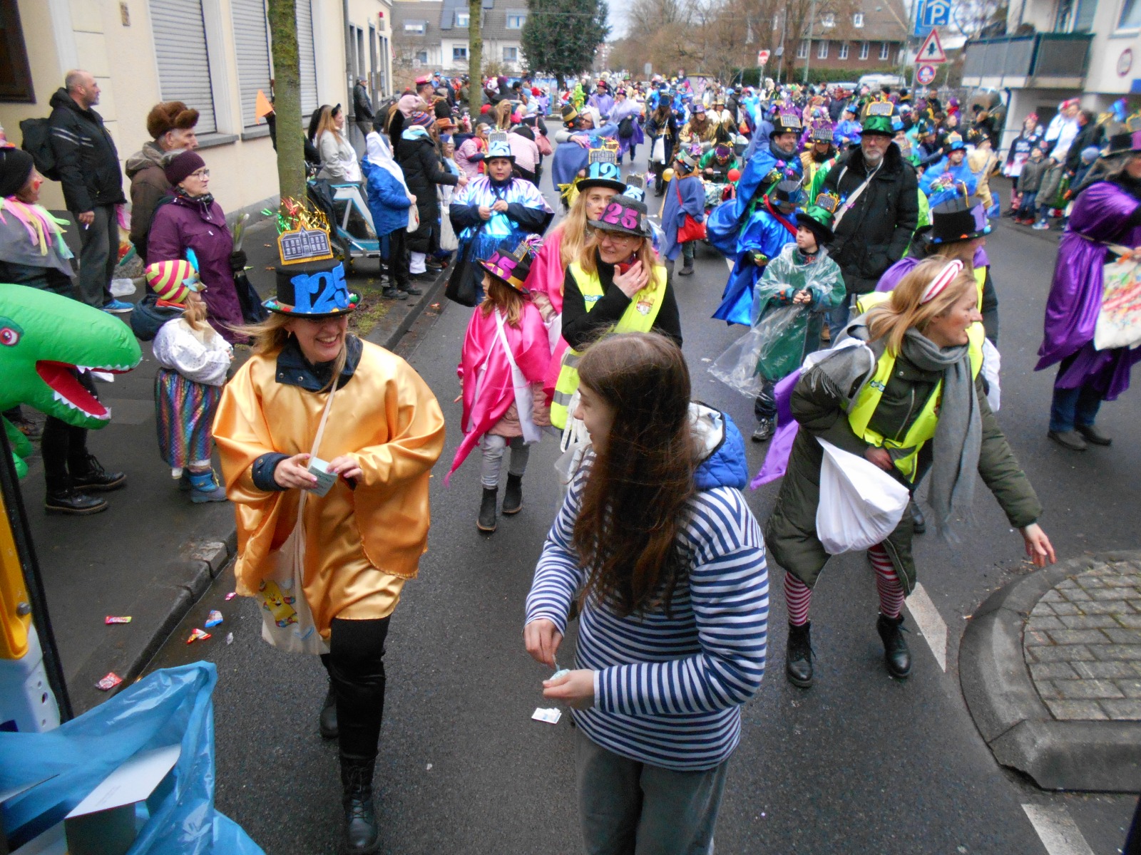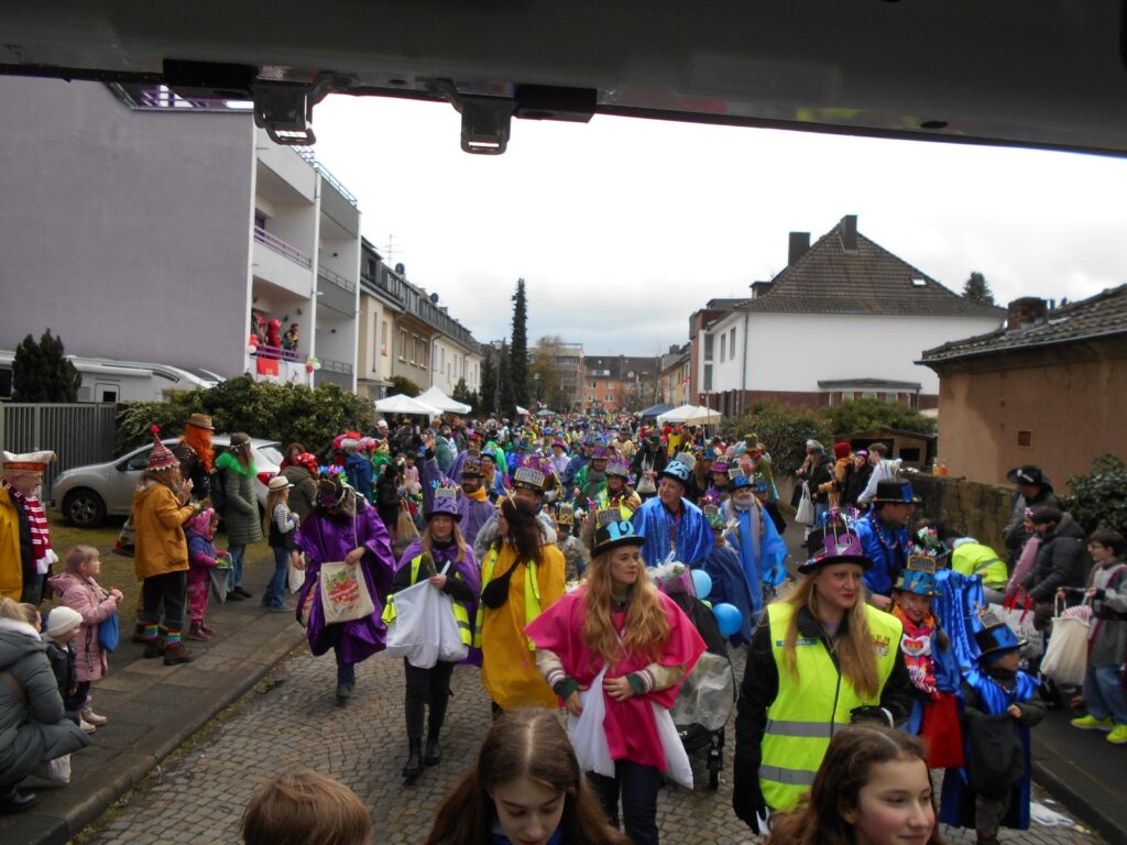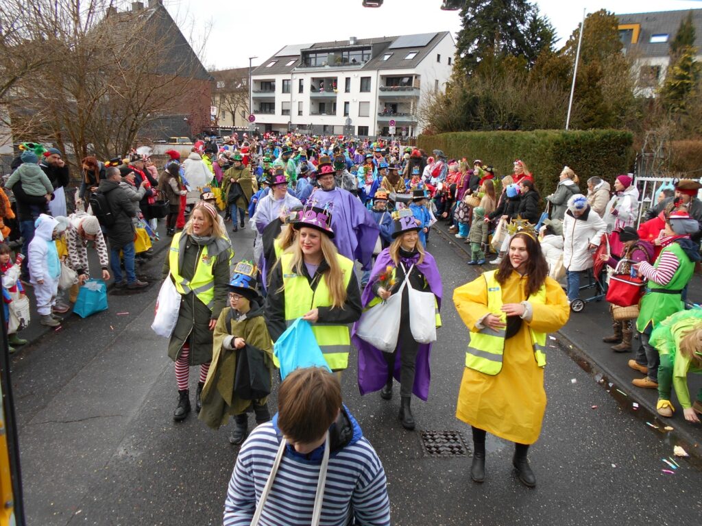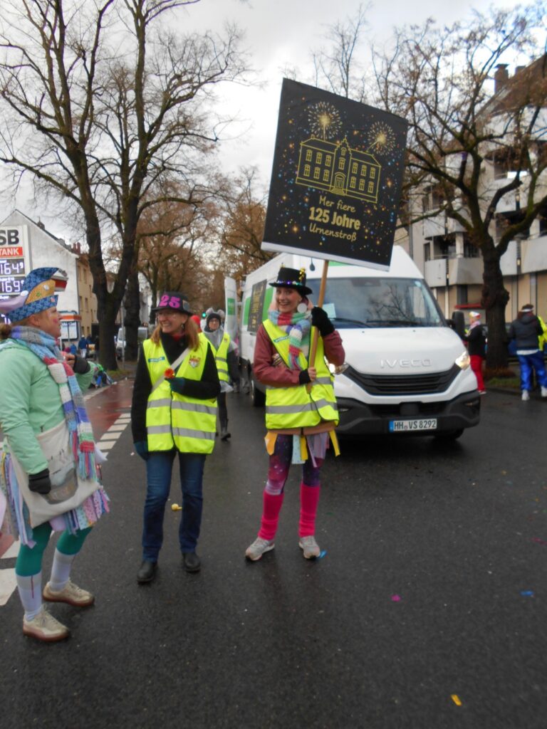 Am Baggagewagen holen sich Mütter und Väter, Kinder und Großeltern die Beutel während des Zugs ab. Drei Ehemalige helfen als Kamelleläufer aus, halten Jutebeutel auf beim Umfüllen der Tüten, transportieren Nachschub durch die Reihen. Vorbei an den Jecken in den metallicfarbenen Ponchos, die lila, blau, grün oder golden glänzen. Dazu haben sich die Teilnehmenden Zylinder gebastelt, auf denen das Motto der Gruppe abgebildet ist: „Mer fiere 125 Johre Urnenstroß“. Mit einem Bild des denkmalgeschützten Schulgebäudes am Standort Urnenstraße, der 125 und bunten Glitzercocktailschirmchen.