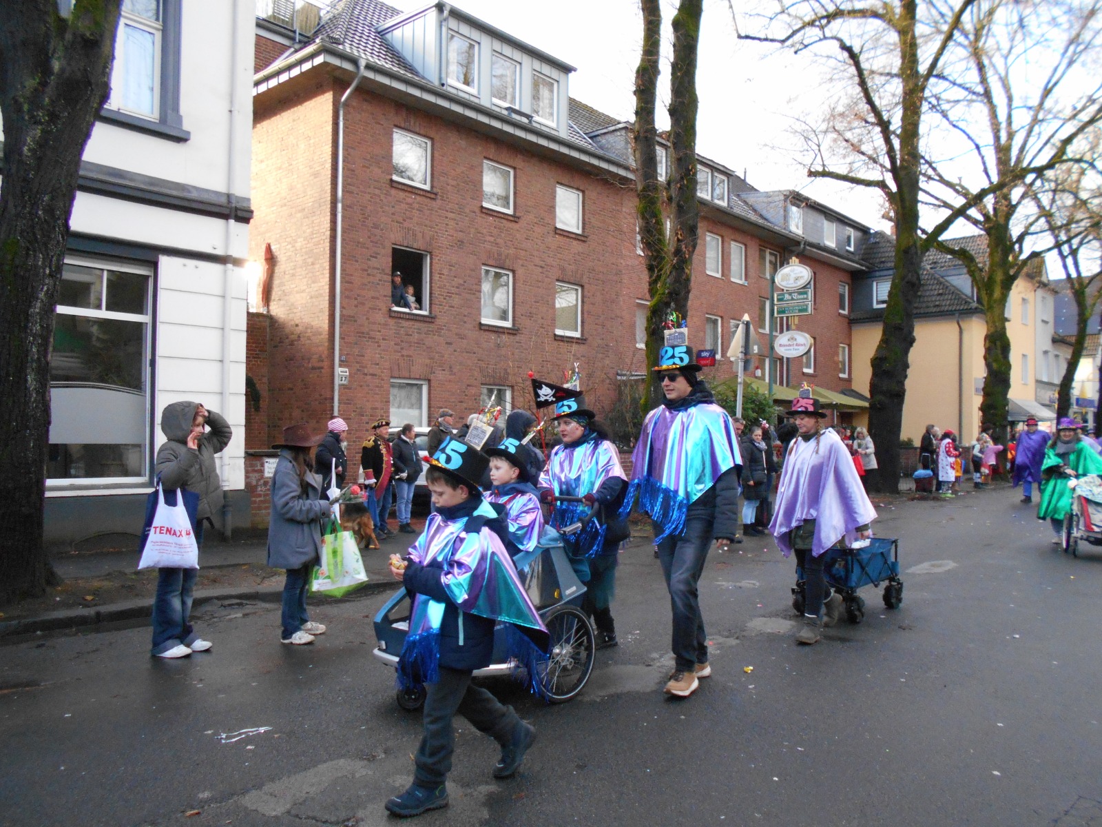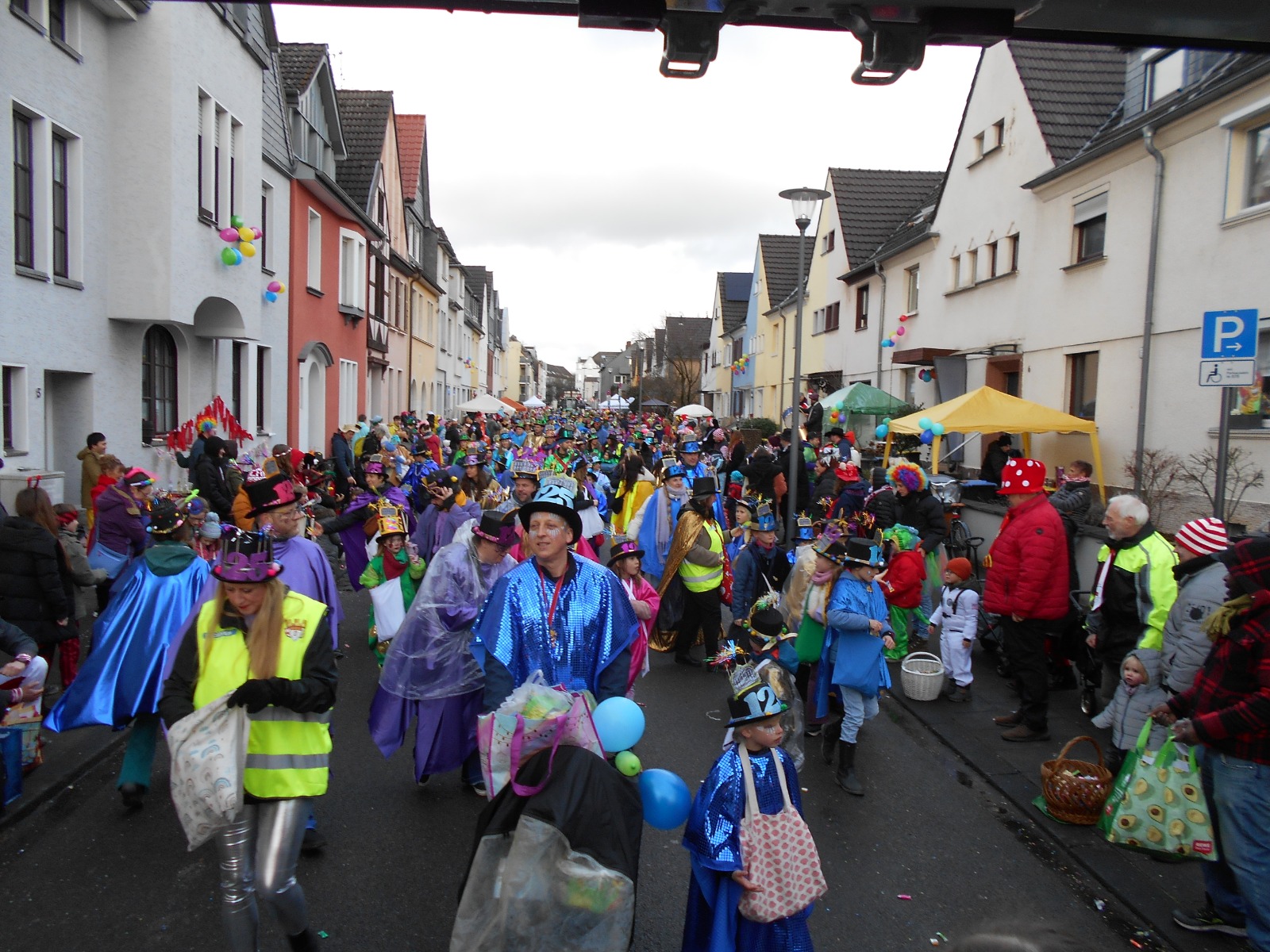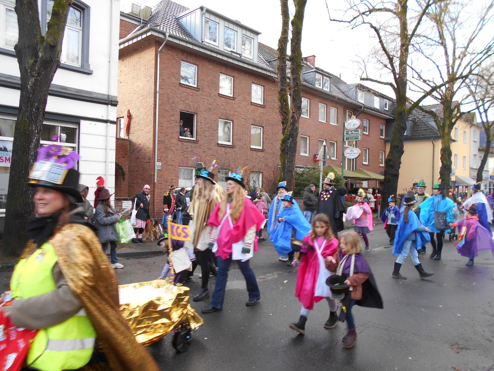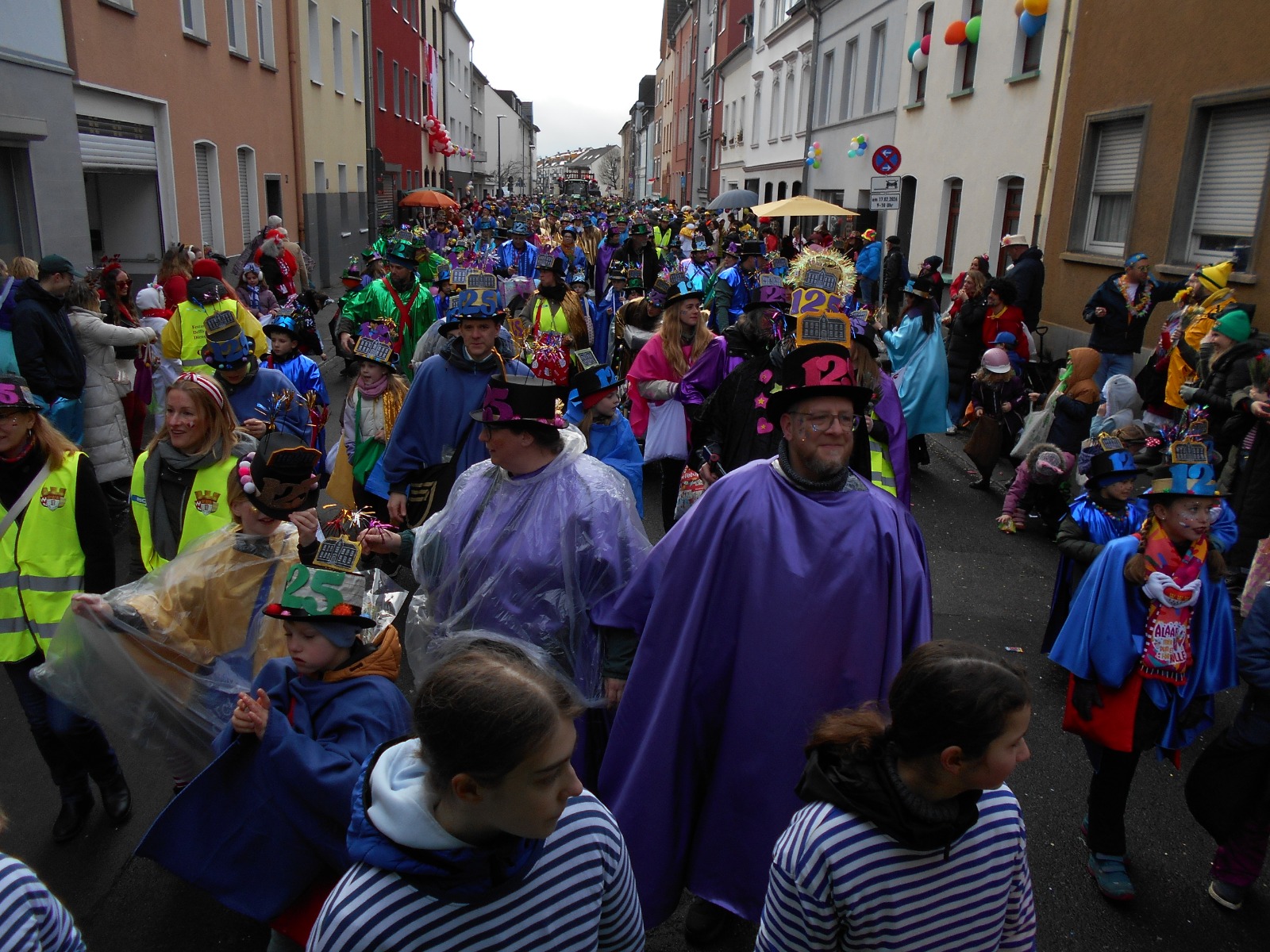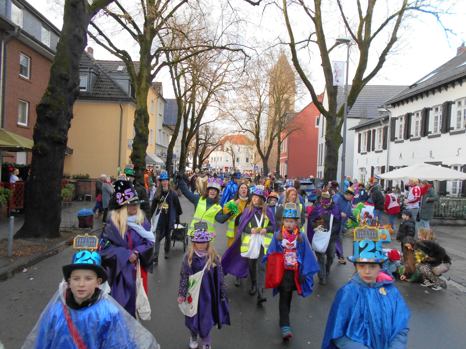 Am Baggagewagen holen sich Mütter und Väter, Kinder und Großeltern die Beutel während des Zugs ab. Drei Ehemalige helfen als Kamelleläufer aus, halten Jutebeutel auf beim Umfüllen der Tüten, transportieren Nachschub durch die Reihen. Vorbei an den Jecken in den metallicfarbenen Ponchos, die lila, blau, grün oder golden glänzen. Dazu haben sich die Teilnehmenden Zylinder gebastelt, auf denen das Motto der Gruppe abgebildet ist: „Mer fiere 125 Johre Urnenstroß“. Mit einem Bild des denkmalgeschützten Schulgebäudes am Standort Urnenstraße, der 125 und bunten Glitzercocktailschirmchen.