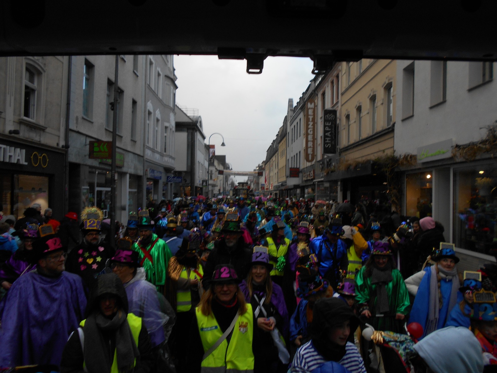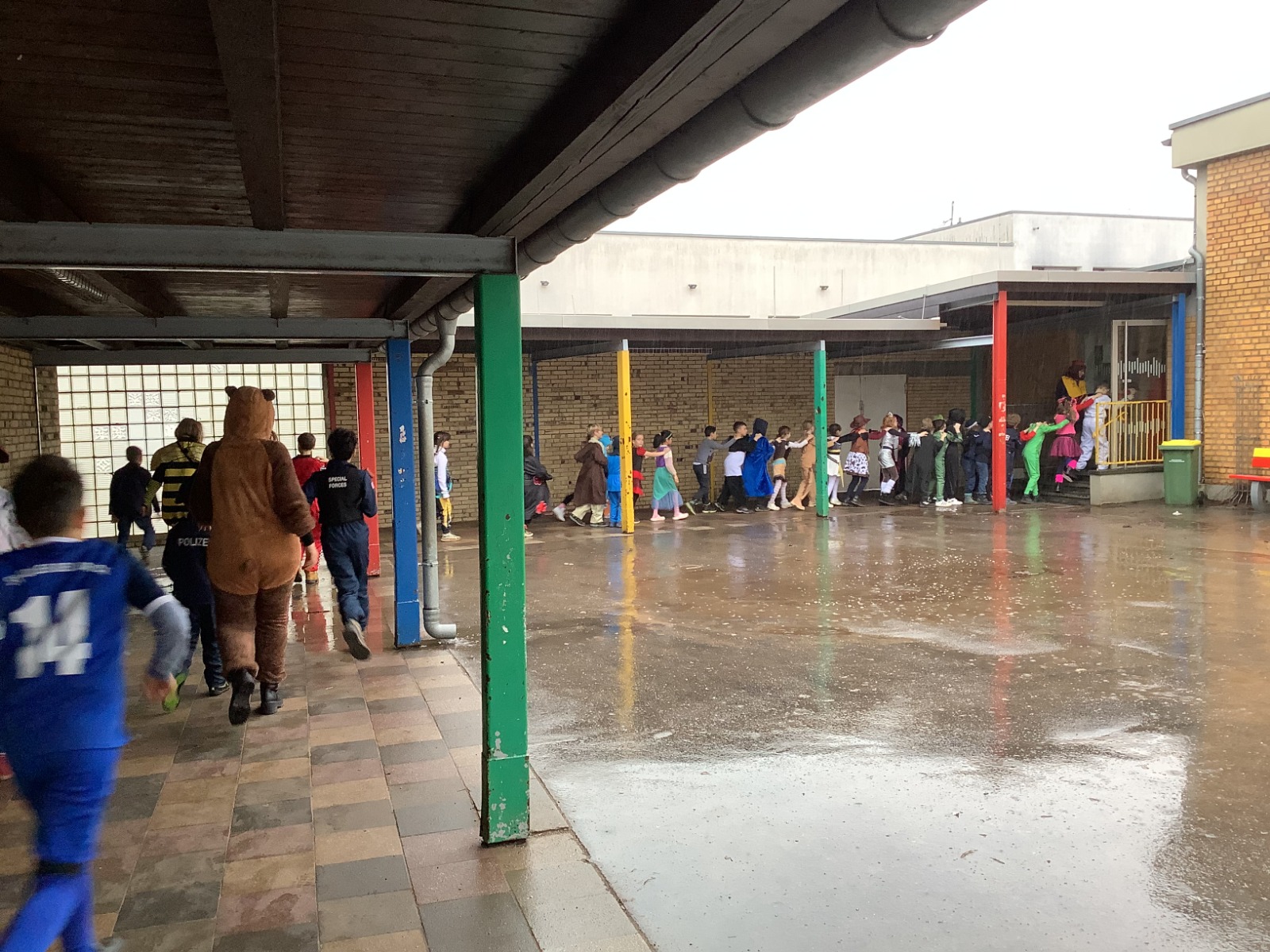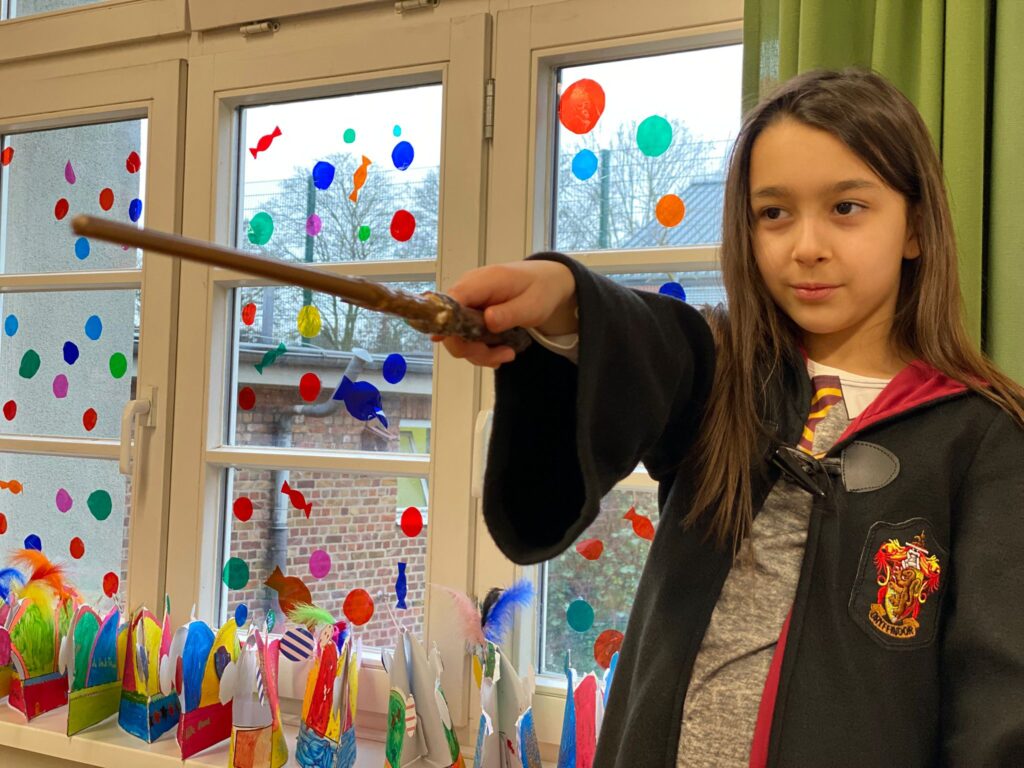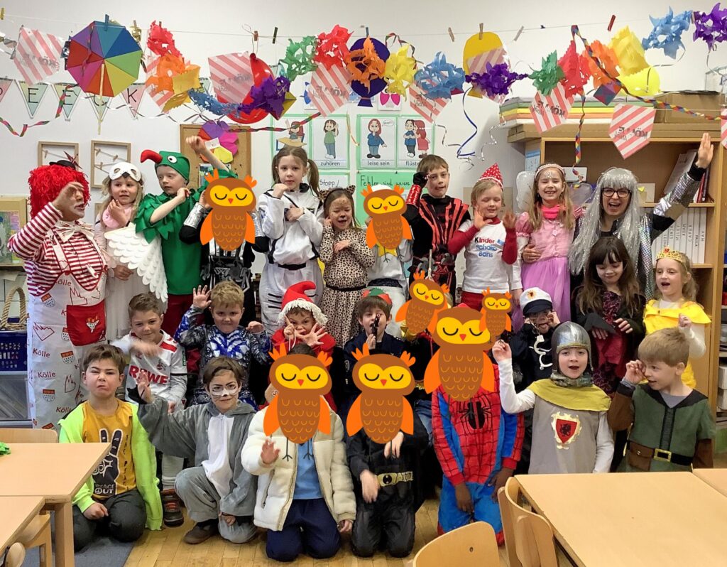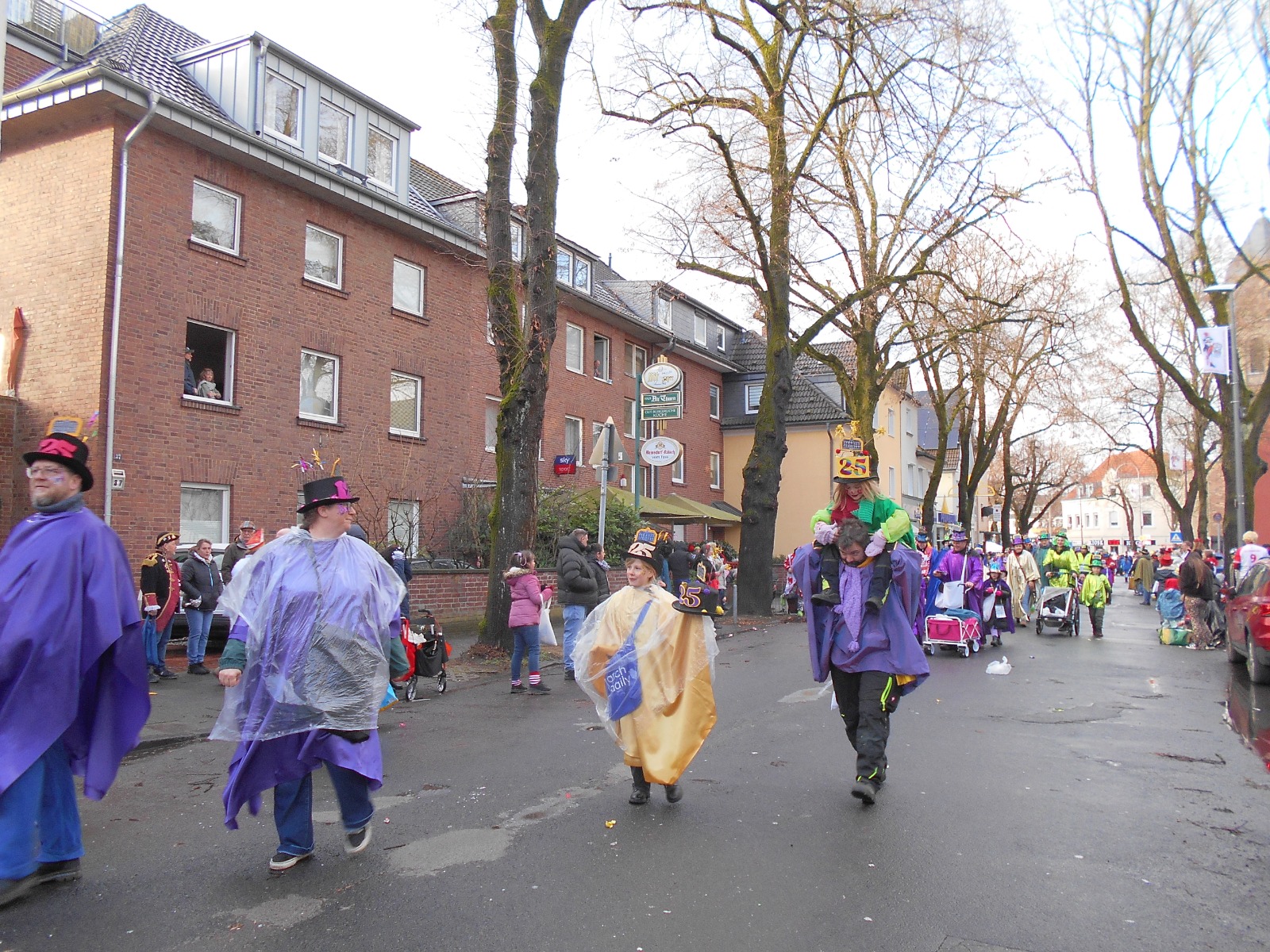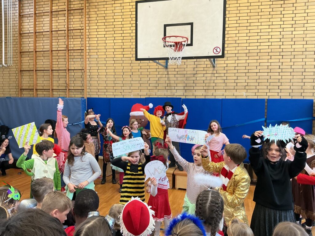 Am Baggagewagen holen sich Mütter und Väter, Kinder und Großeltern die Beutel während des Zugs ab. Drei Ehemalige helfen als Kamelleläufer aus, halten Jutebeutel auf beim Umfüllen der Tüten, transportieren Nachschub durch die Reihen. Vorbei an den Jecken in den metallicfarbenen Ponchos, die lila, blau, grün oder golden glänzen. Dazu haben sich die Teilnehmenden Zylinder gebastelt, auf denen das Motto der Gruppe abgebildet ist: „Mer fiere 125 Johre Urnenstroß“. Mit einem Bild des denkmalgeschützten Schulgebäudes am Standort Urnenstraße, der 125 und bunten Glitzercocktailschirmchen.