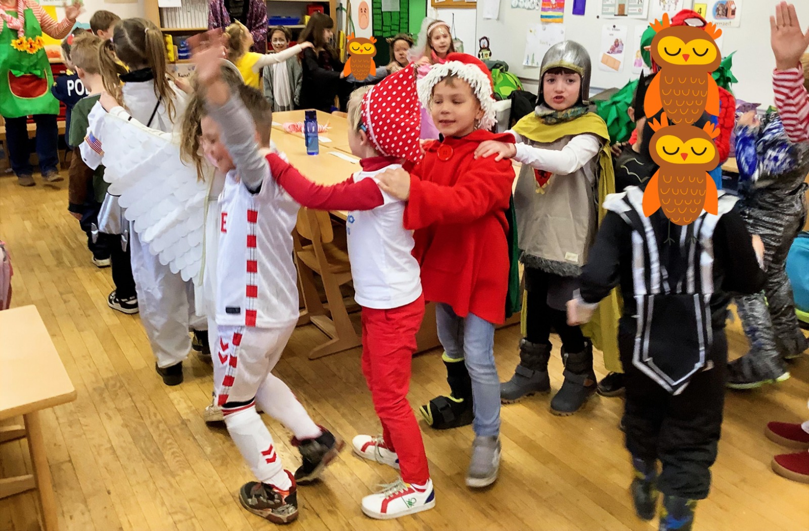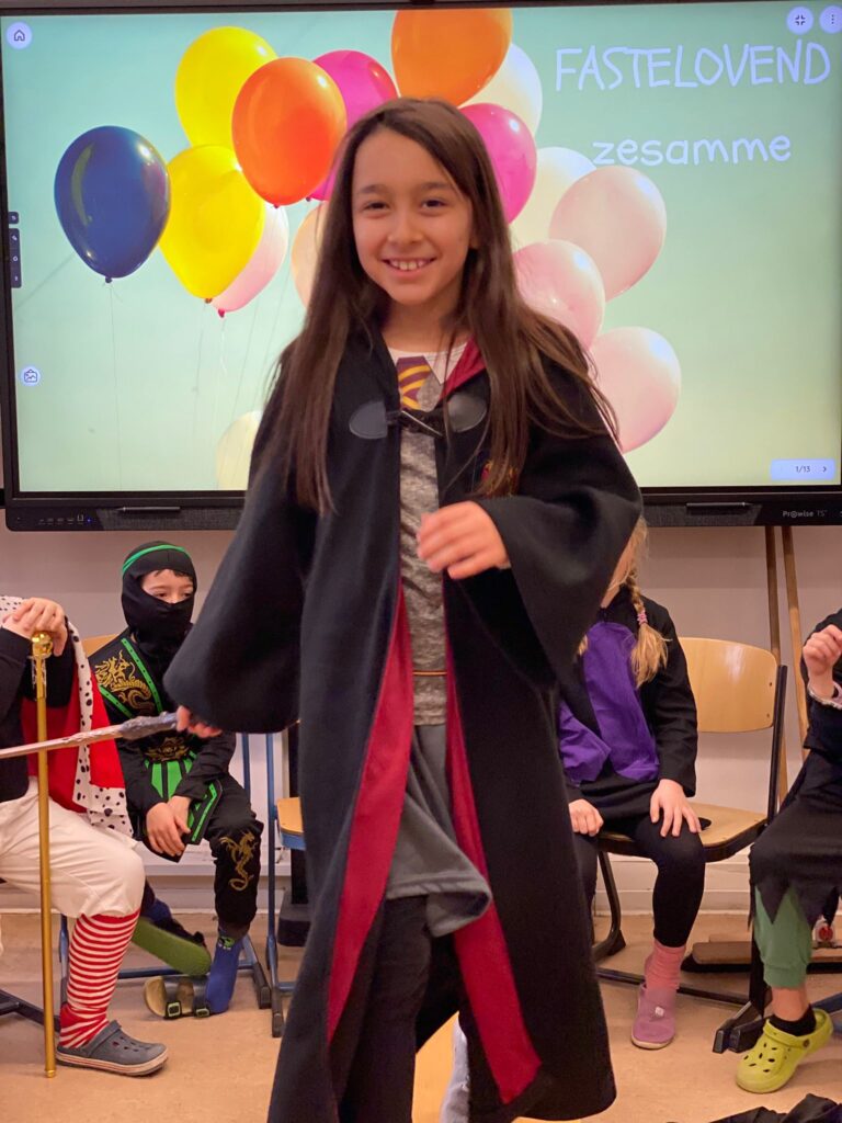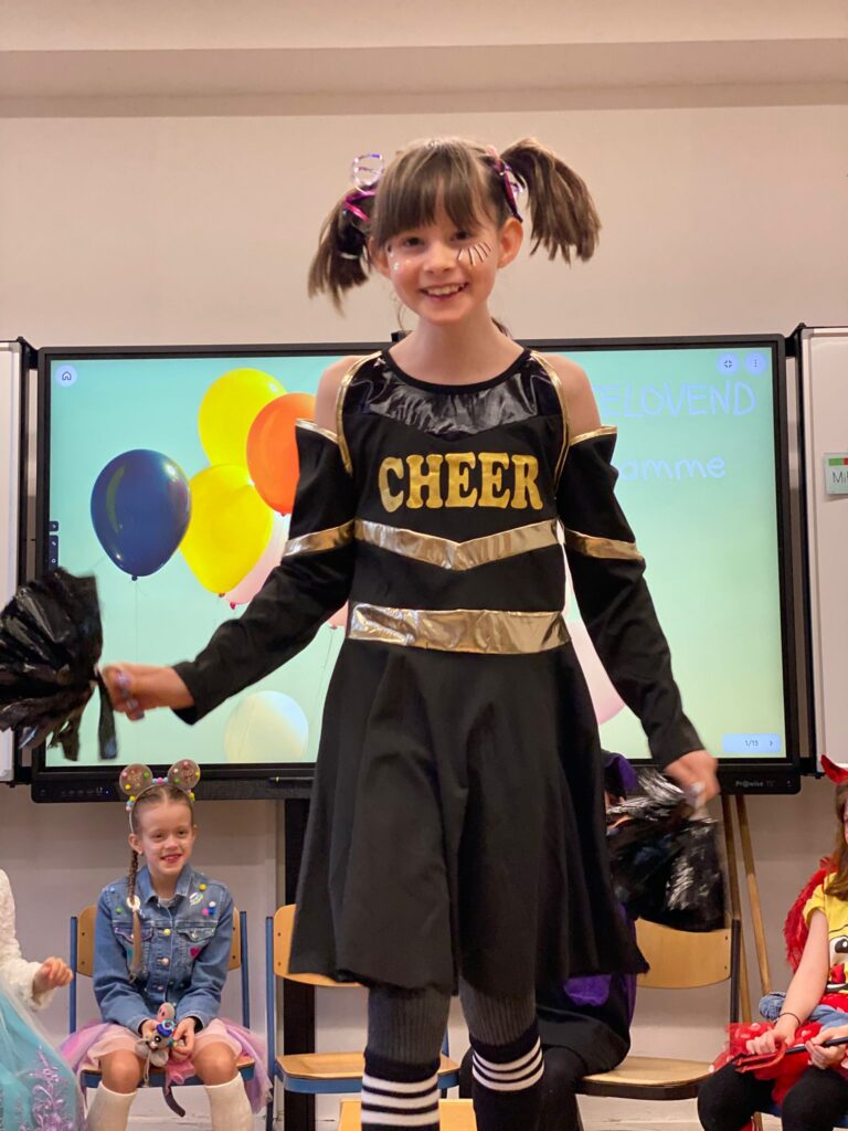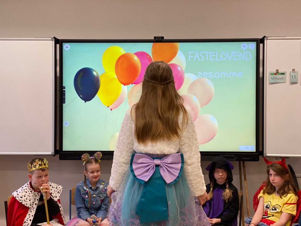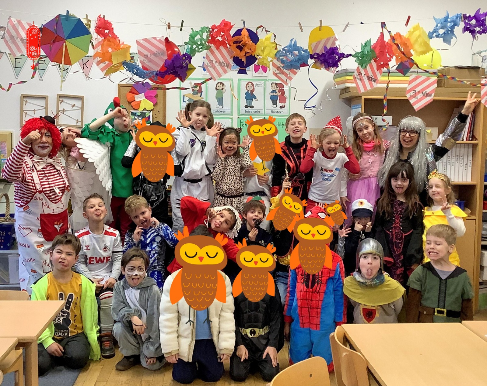 Am Baggagewagen holen sich Mütter und Väter, Kinder und Großeltern die Beutel während des Zugs ab. Drei Ehemalige helfen als Kamelleläufer aus, halten Jutebeutel auf beim Umfüllen der Tüten, transportieren Nachschub durch die Reihen. Vorbei an den Jecken in den metallicfarbenen Ponchos, die lila, blau, grün oder golden glänzen. Dazu haben sich die Teilnehmenden Zylinder gebastelt, auf denen das Motto der Gruppe abgebildet ist: „Mer fiere 125 Johre Urnenstroß“. Mit einem Bild des denkmalgeschützten Schulgebäudes am Standort Urnenstraße, der 125 und bunten Glitzercocktailschirmchen.