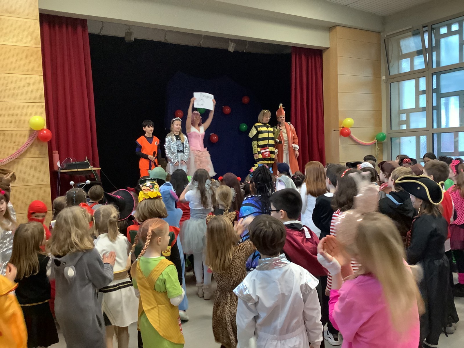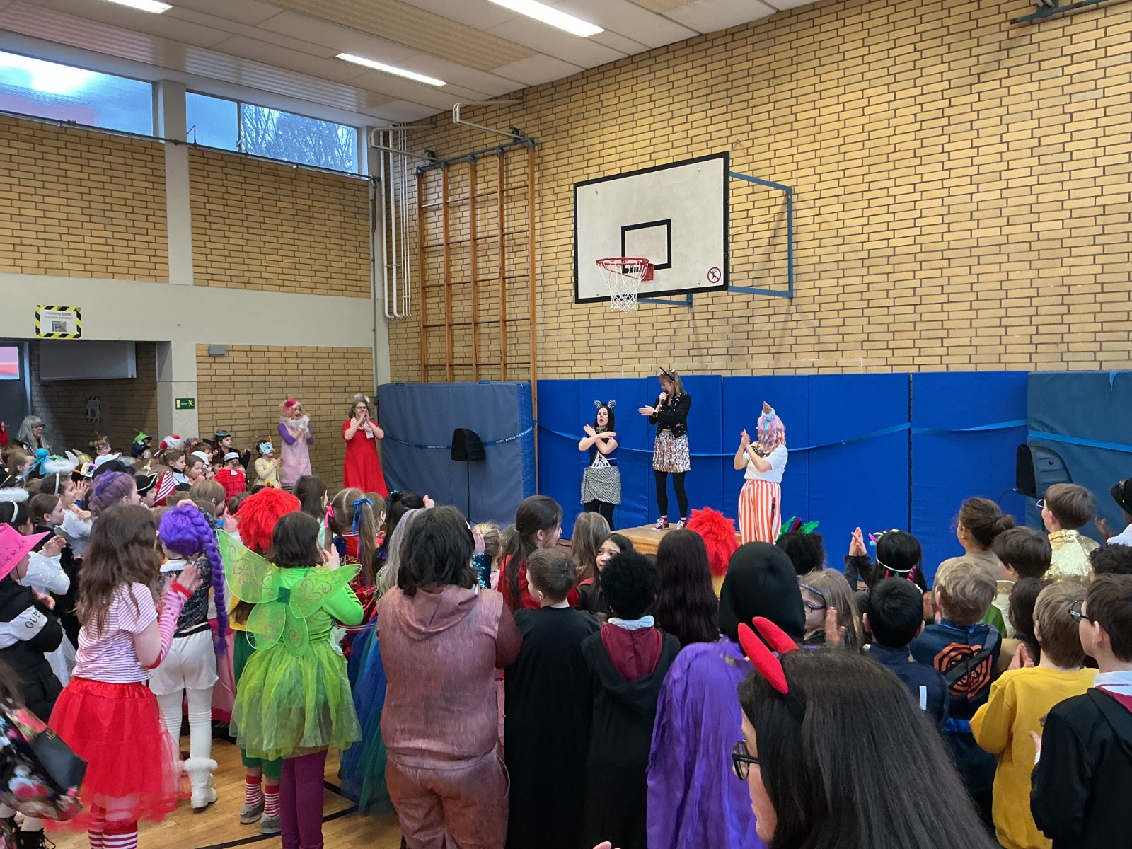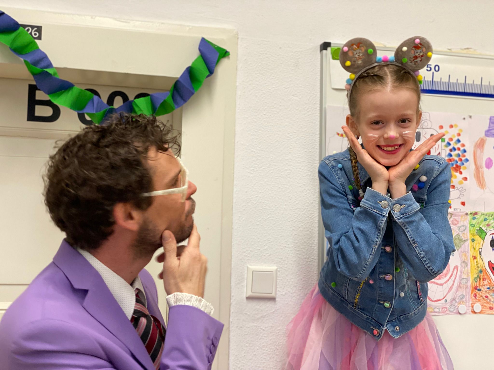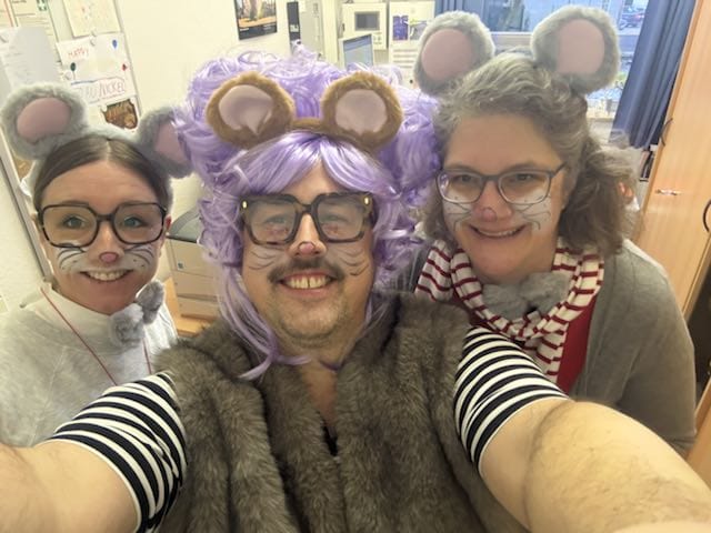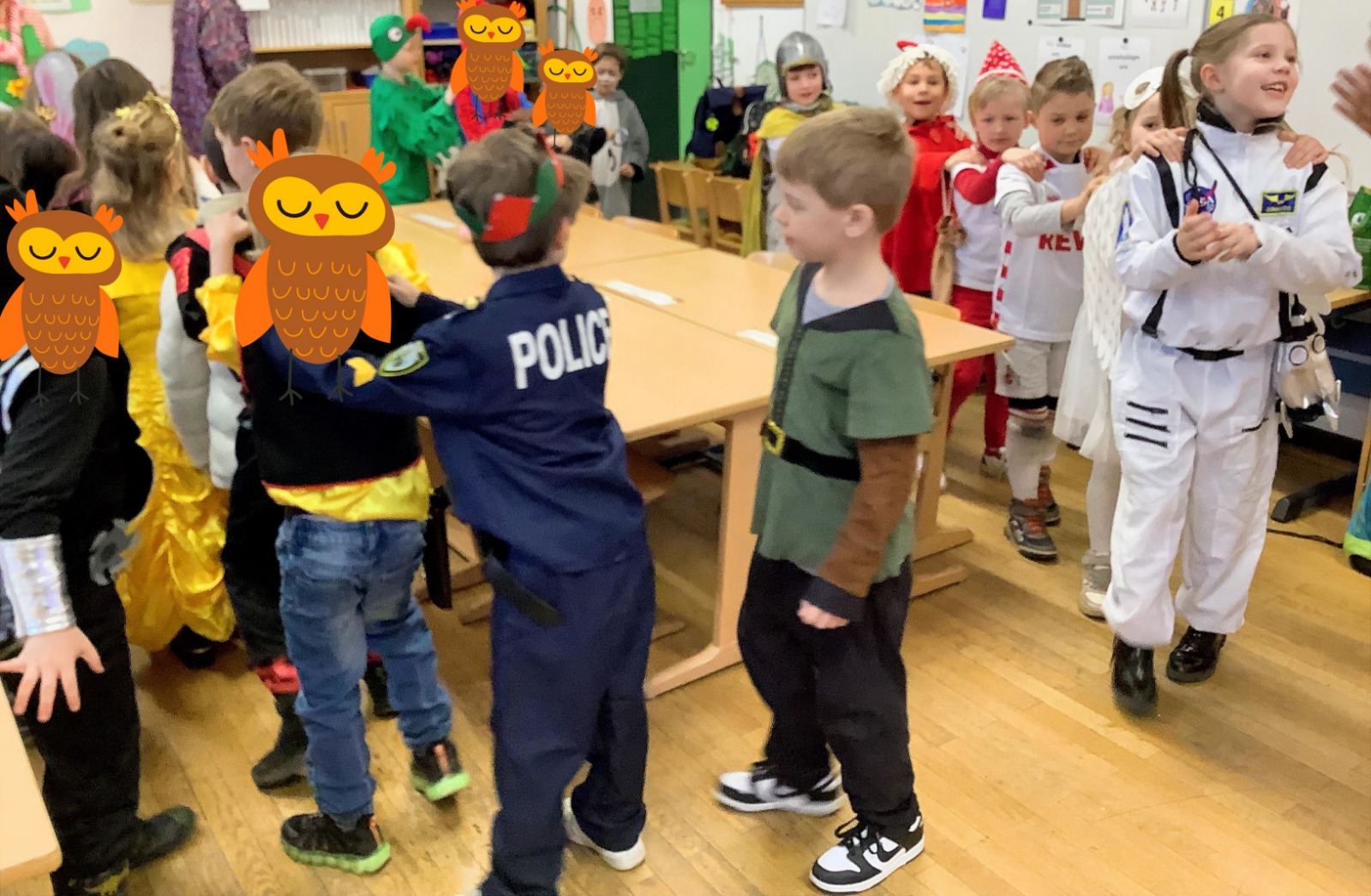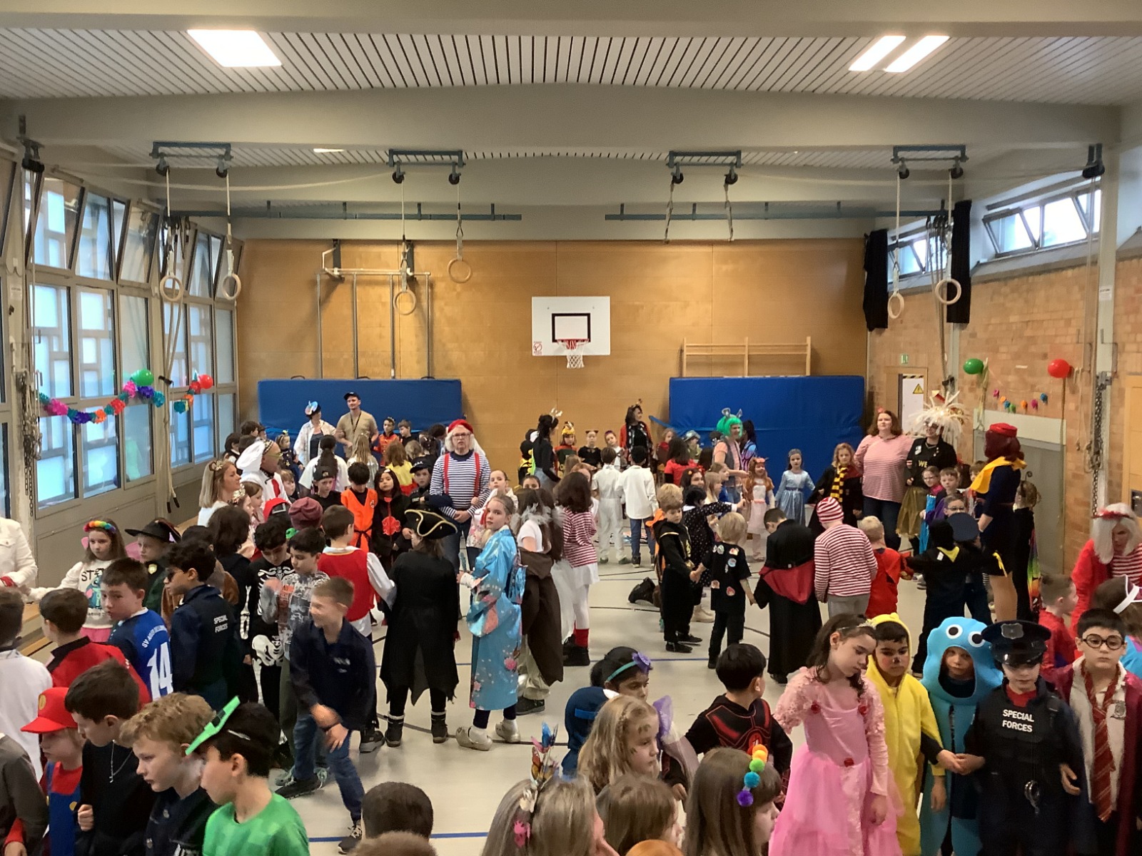 Am Baggagewagen holen sich Mütter und Väter, Kinder und Großeltern die Beutel während des Zugs ab. Drei Ehemalige helfen als Kamelleläufer aus, halten Jutebeutel auf beim Umfüllen der Tüten, transportieren Nachschub durch die Reihen. Vorbei an den Jecken in den metallicfarbenen Ponchos, die lila, blau, grün oder golden glänzen. Dazu haben sich die Teilnehmenden Zylinder gebastelt, auf denen das Motto der Gruppe abgebildet ist: „Mer fiere 125 Johre Urnenstroß“. Mit einem Bild des denkmalgeschützten Schulgebäudes am Standort Urnenstraße, der 125 und bunten Glitzercocktailschirmchen.