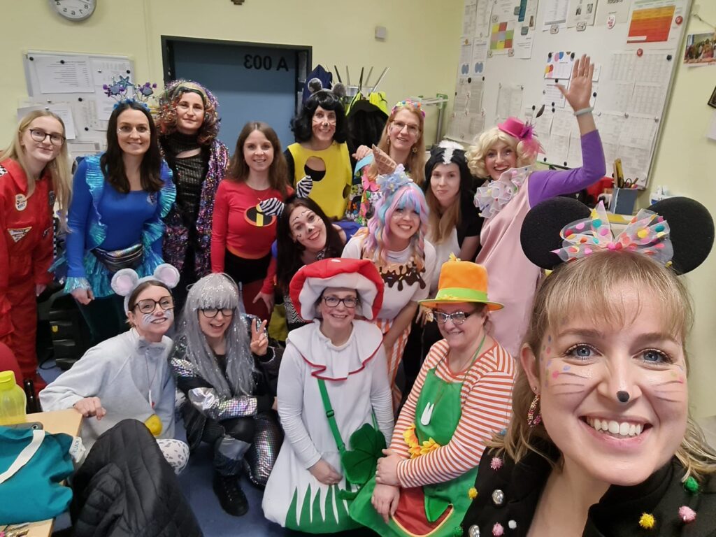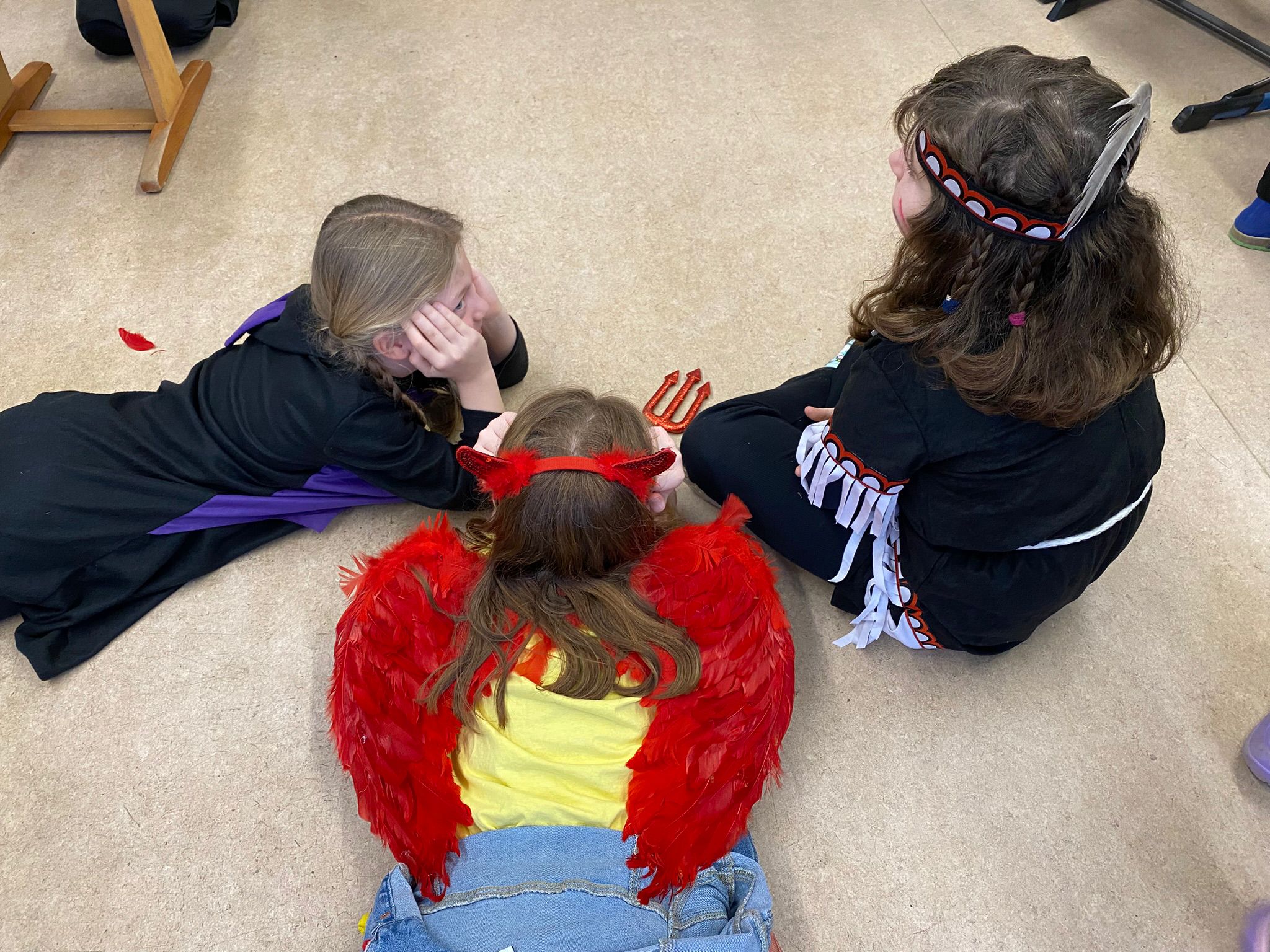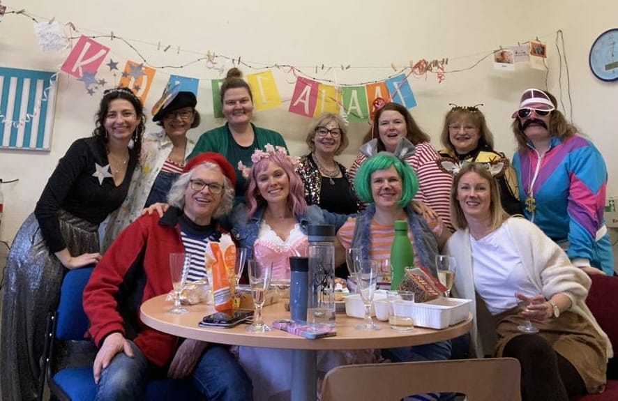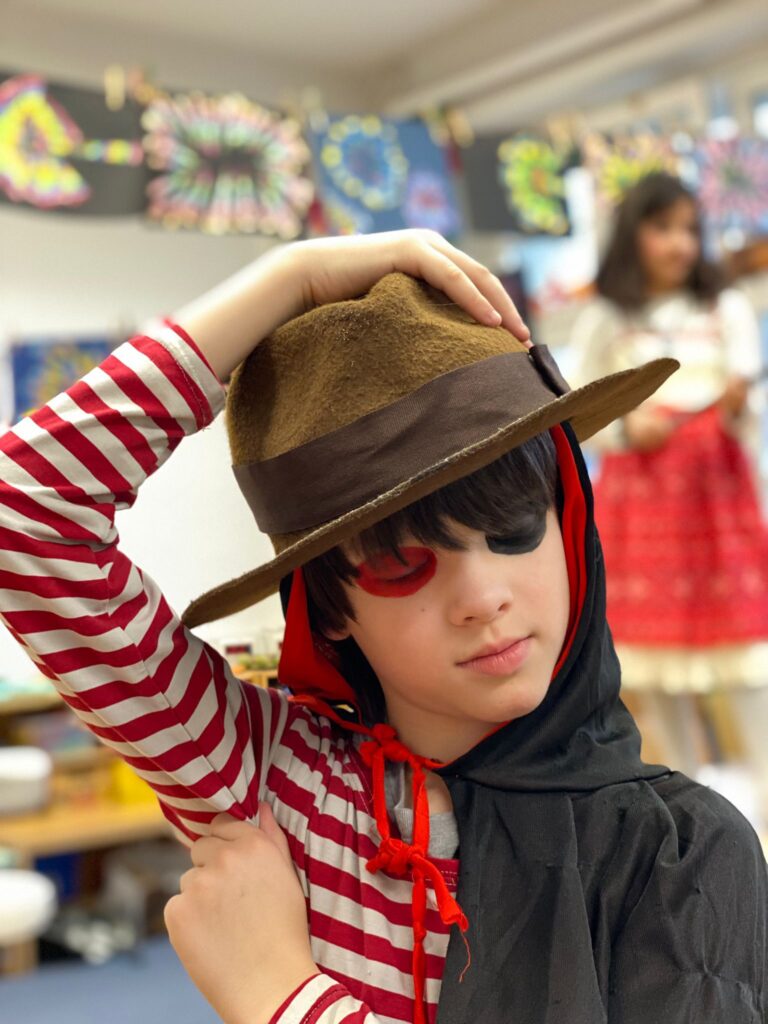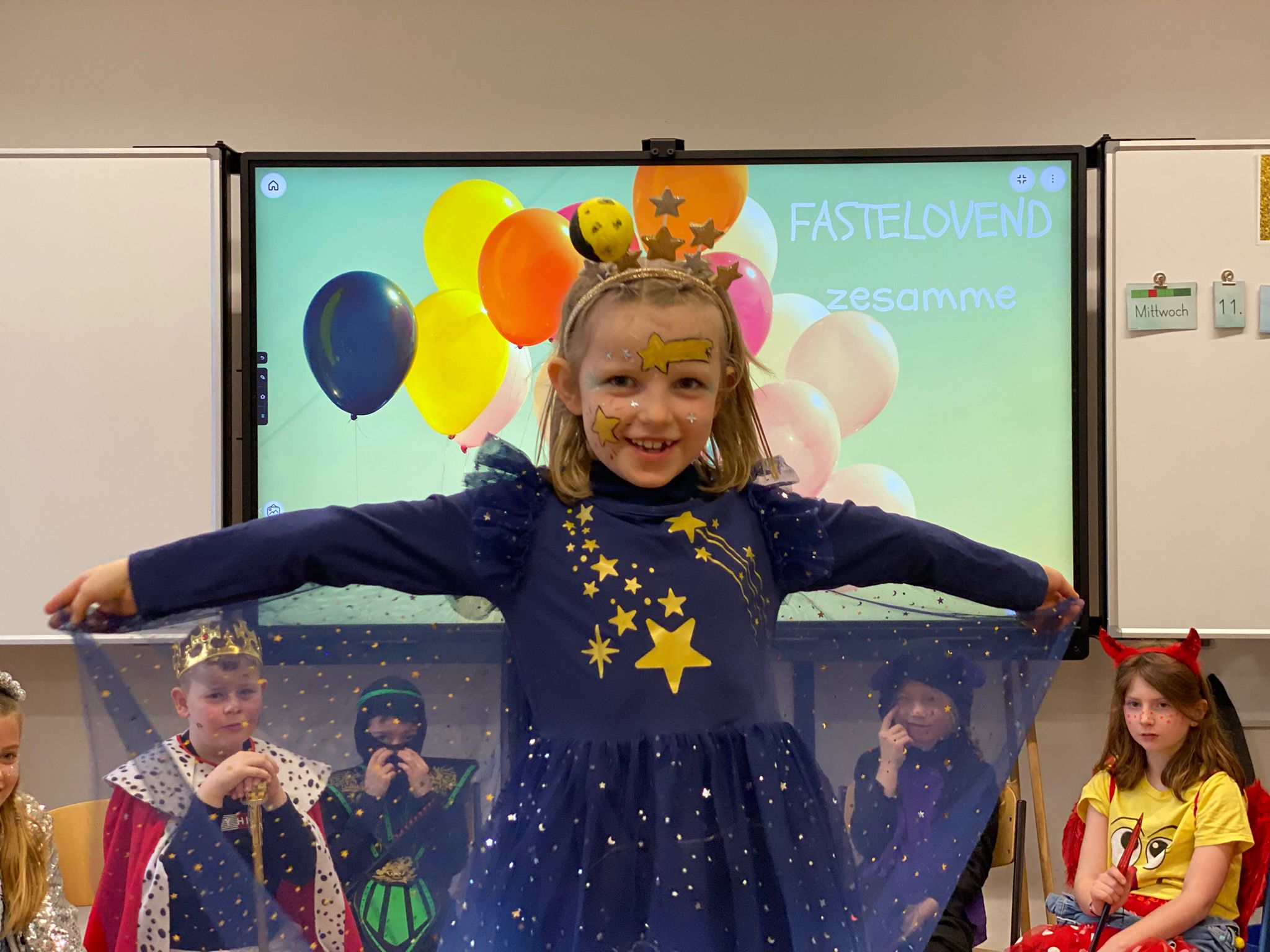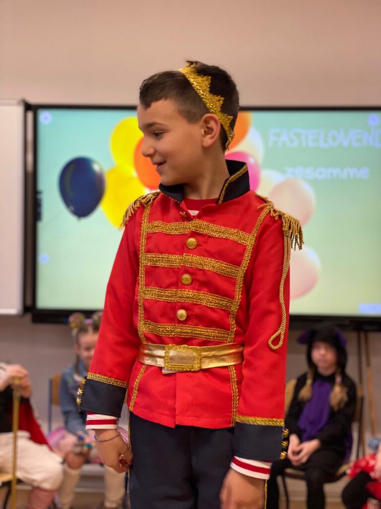 Am Baggagewagen holen sich Mütter und Väter, Kinder und Großeltern die Beutel während des Zugs ab. Drei Ehemalige helfen als Kamelleläufer aus, halten Jutebeutel auf beim Umfüllen der Tüten, transportieren Nachschub durch die Reihen. Vorbei an den Jecken in den metallicfarbenen Ponchos, die lila, blau, grün oder golden glänzen. Dazu haben sich die Teilnehmenden Zylinder gebastelt, auf denen das Motto der Gruppe abgebildet ist: „Mer fiere 125 Johre Urnenstroß“. Mit einem Bild des denkmalgeschützten Schulgebäudes am Standort Urnenstraße, der 125 und bunten Glitzercocktailschirmchen.