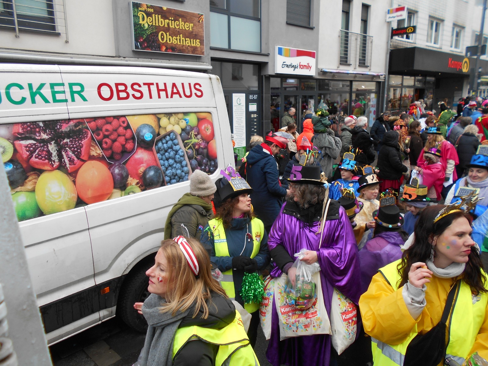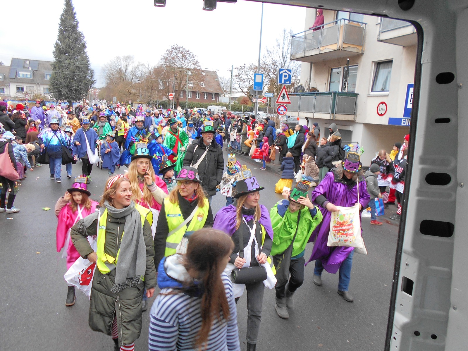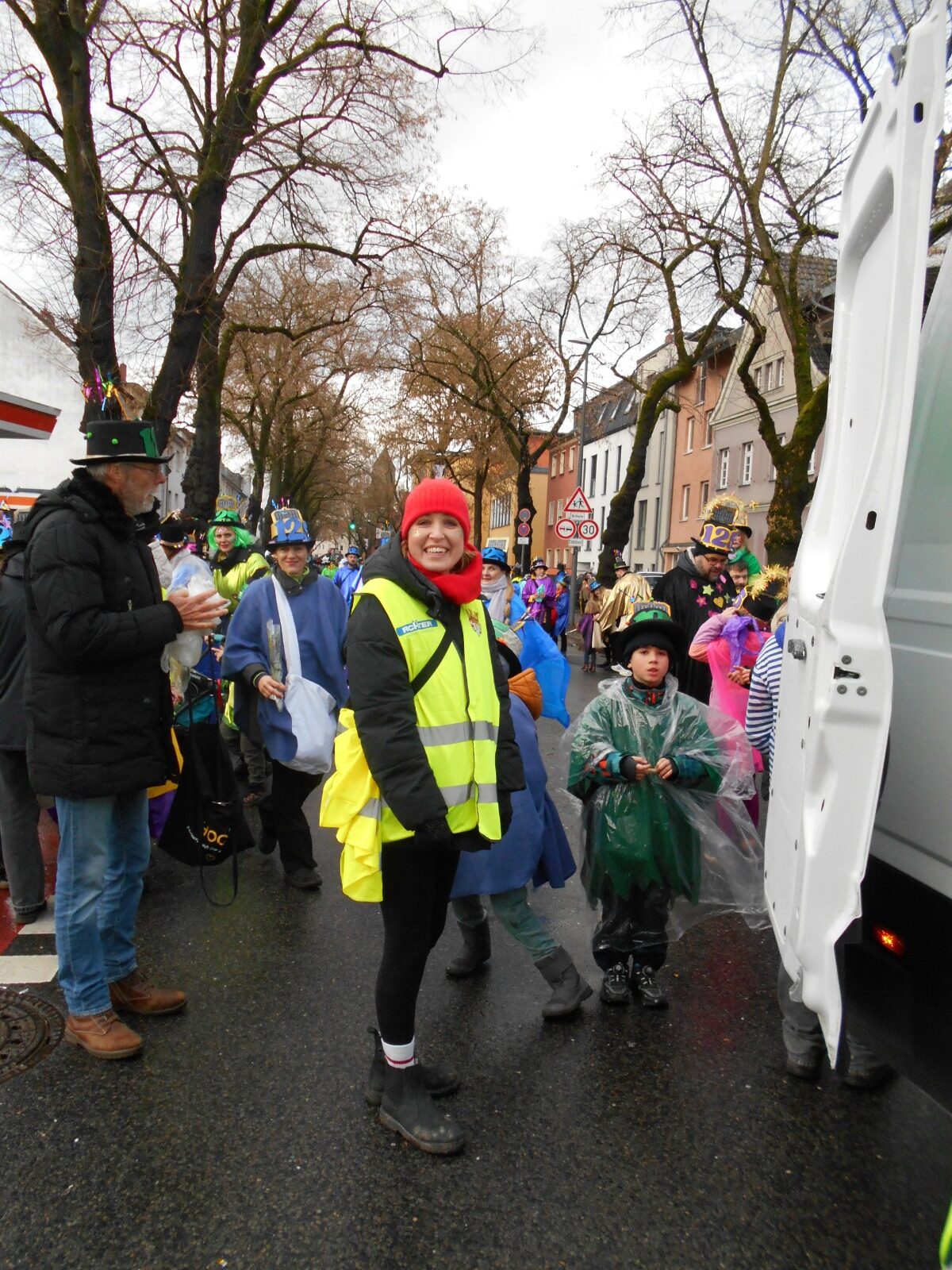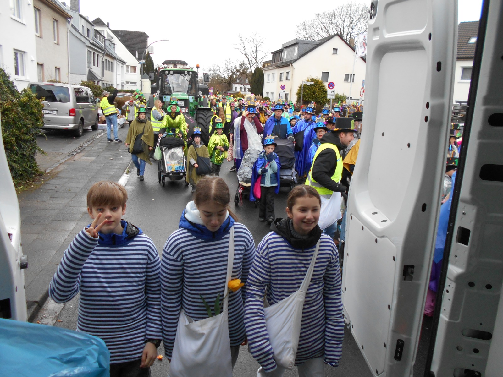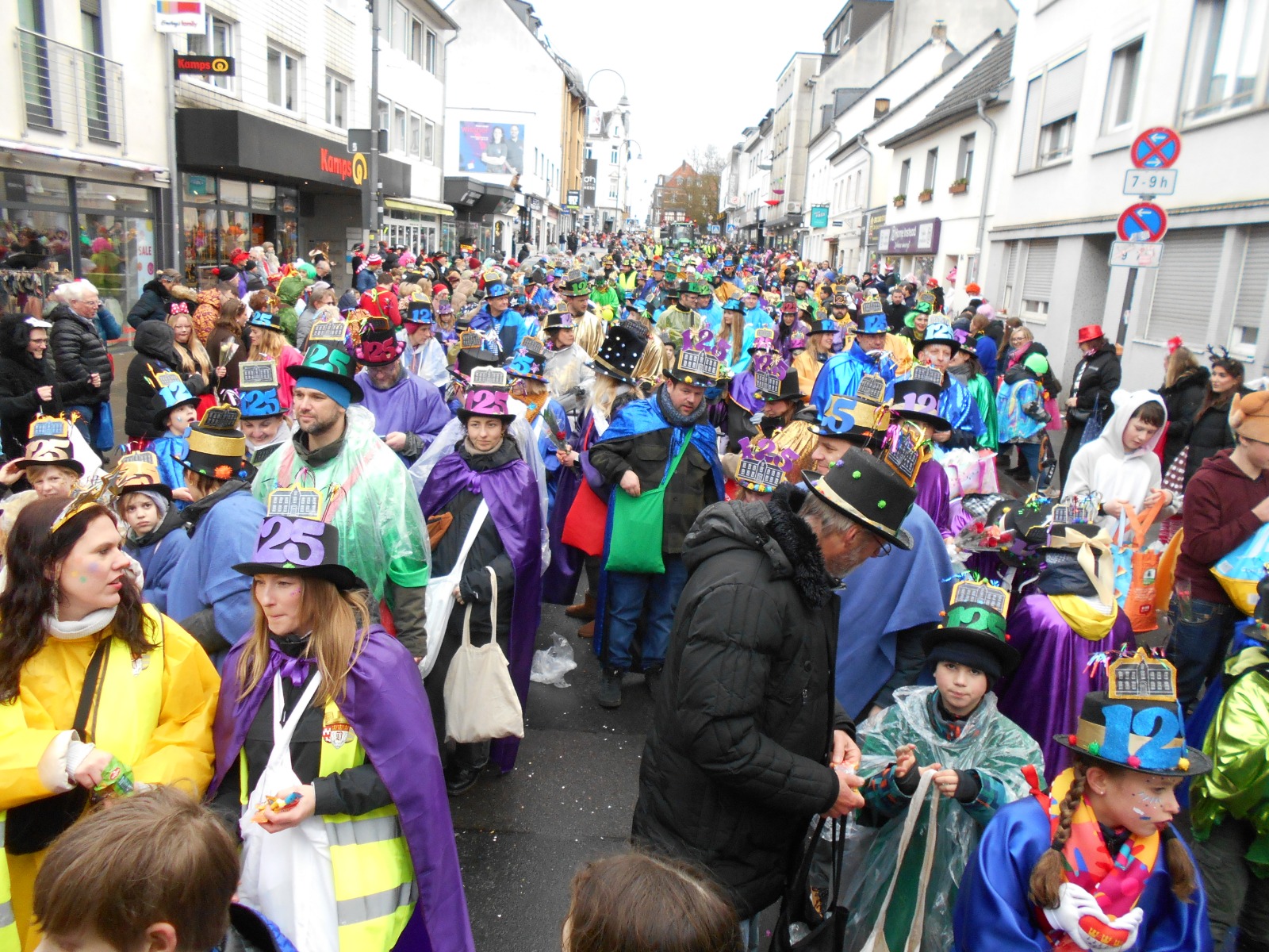 Aber in die Jahre gekommen? Sind beide nicht. Der Dienstagszug war 1901 seiner Zeit ganz offensichtlich schon voraus. Als Motto habe er „vor allem die schlechten Wegverhältnisse in Dellbrück“ angeprangert, heißt es auf der Homepage weiter. Na, und um die Schlaglöcher, da müssen die Jecken auch im aktuellen Dienstagszug manövrieren. In vielen haben sich Pfützen gebildet, pladdern die Regentropfen ins Nass, als die 39 Gruppen des Dienstagszugs an ihnen vorbeiflanieren. Gruppe 9, die KGS, mit den 200 großen und kleinen Jecken darunter. Von denen sich manche ganz augenscheinlich nicht entscheiden können, ob sie die Leckereien nun wirklich alle ins Publikum werfen oder doch lieber noch etwas selber naschen wollen. Das haben sie sich aber auch verdient, denn wenn sich ein Jeck bei dem Wetter noch in den närrischen Lindwurm stellt, dann hat er auch Kamelle verdient.