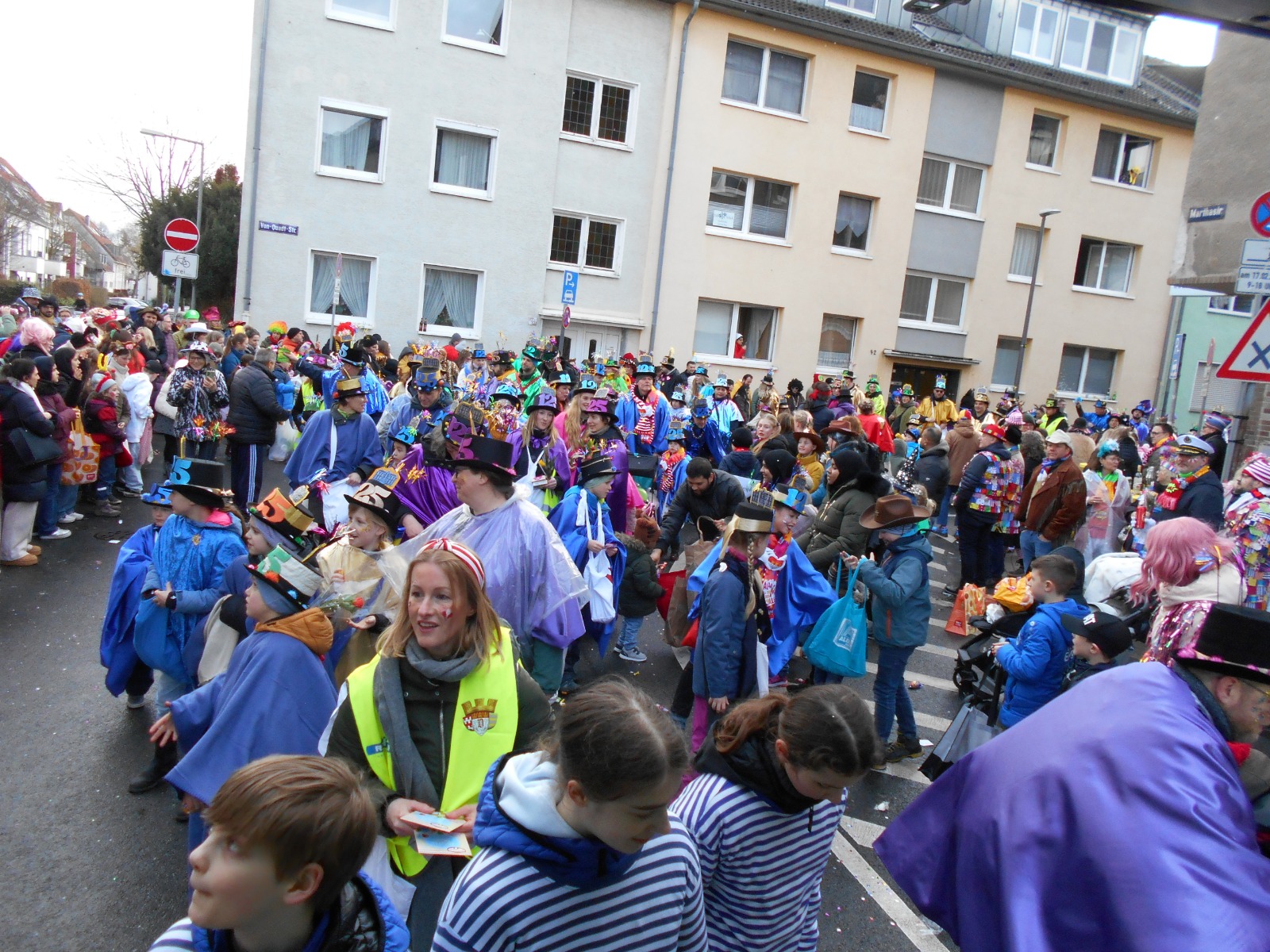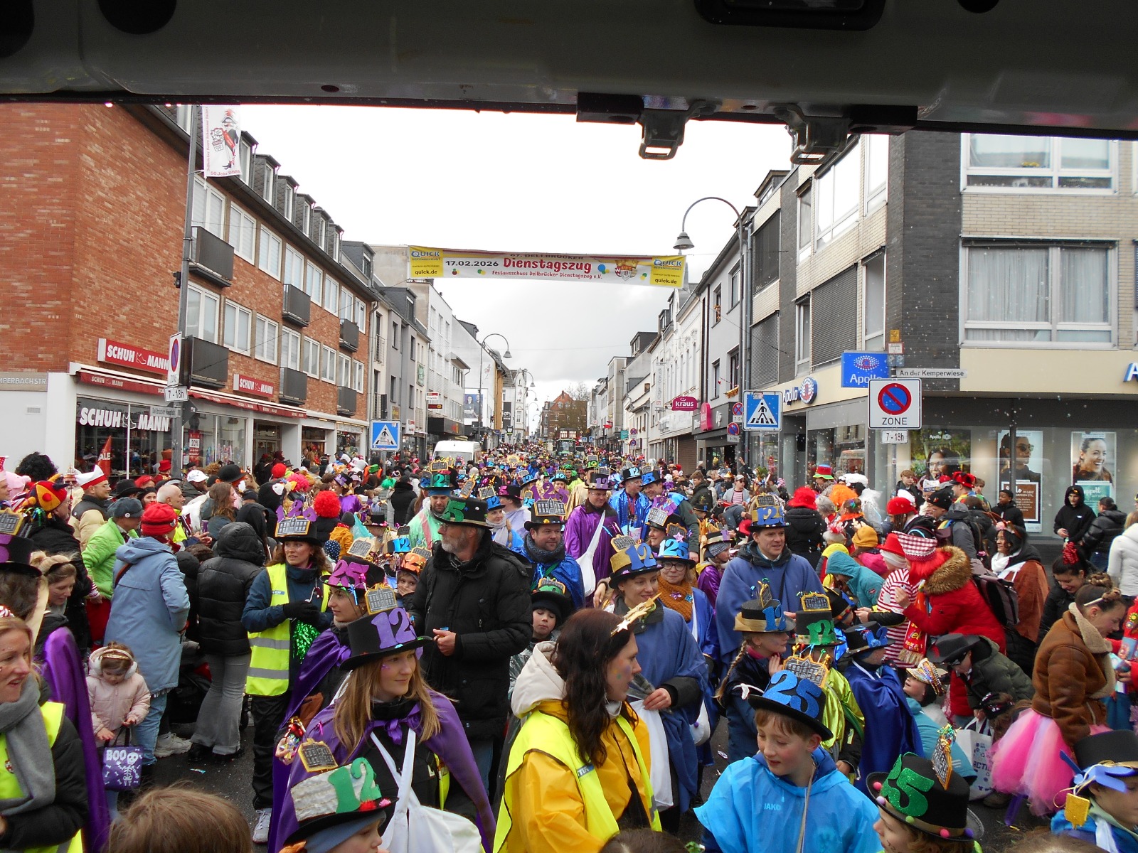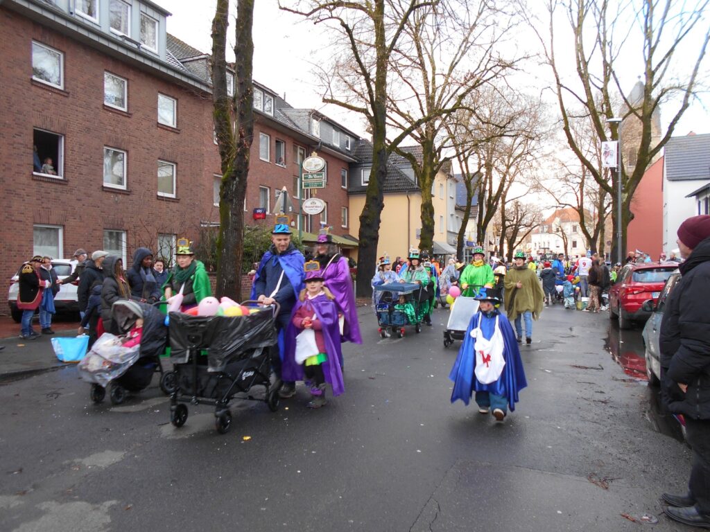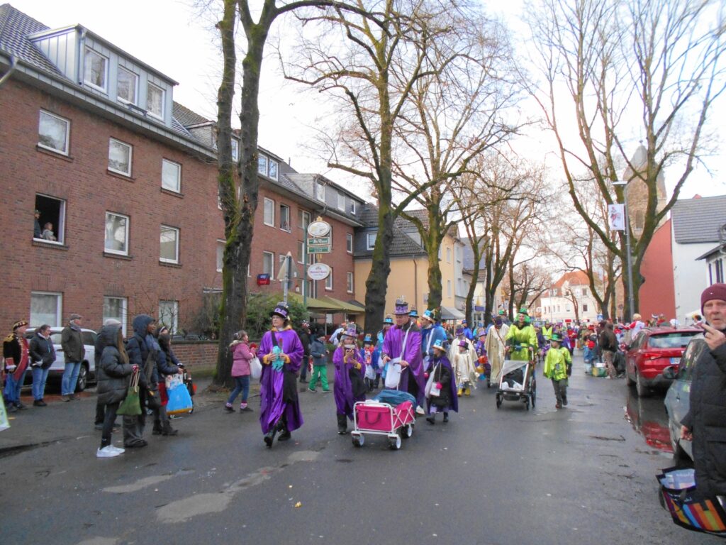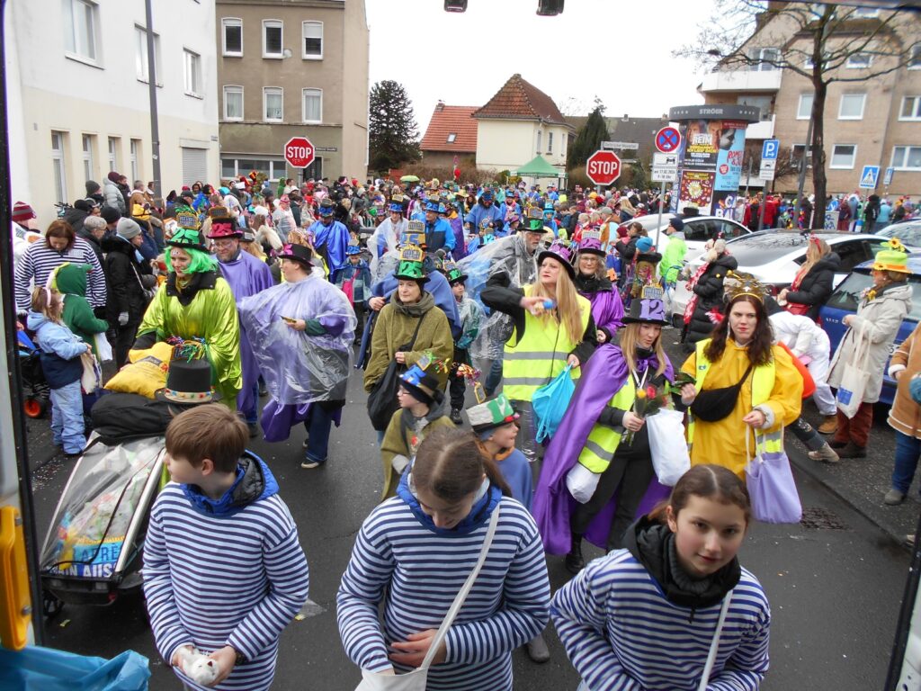 17.2.2026. Ganz ehrlich, bei dem Wetter muss ein Jeck Karneval schon wirklich mögen, um zum Dellbrücker Dienstagszug zu kommen. Wie die gut 200 großen und kleinen Menschen, die mit Regenschutz und einem Lachen im Gesicht dennoch von der Hagedornstraße aus über den Mauspfad, Auf der Jüchen, Talstraße, Grafenmühlenweg, Von-Quadt- und Marthastraße, Im Fichtenhain, Erna-, Urnen-, Hünen- und Dellbrücker Hauptstraße laufen. Und Kamelle und Strüßjer werfen an die vielen Närrinnen und Narren, die am Straßenrand rufen und schunkeln und sich auch von Wind und Schauern das bunte Karnevalstreiben nicht, doch, das Wortspiel muss sein, verhageln lassen.