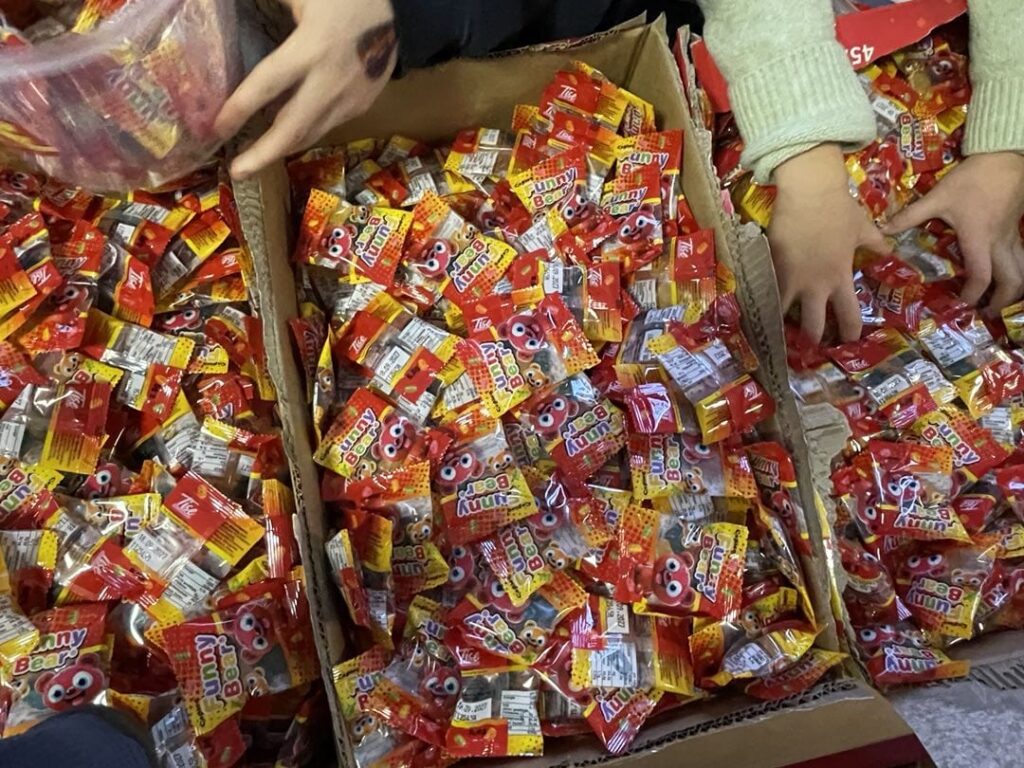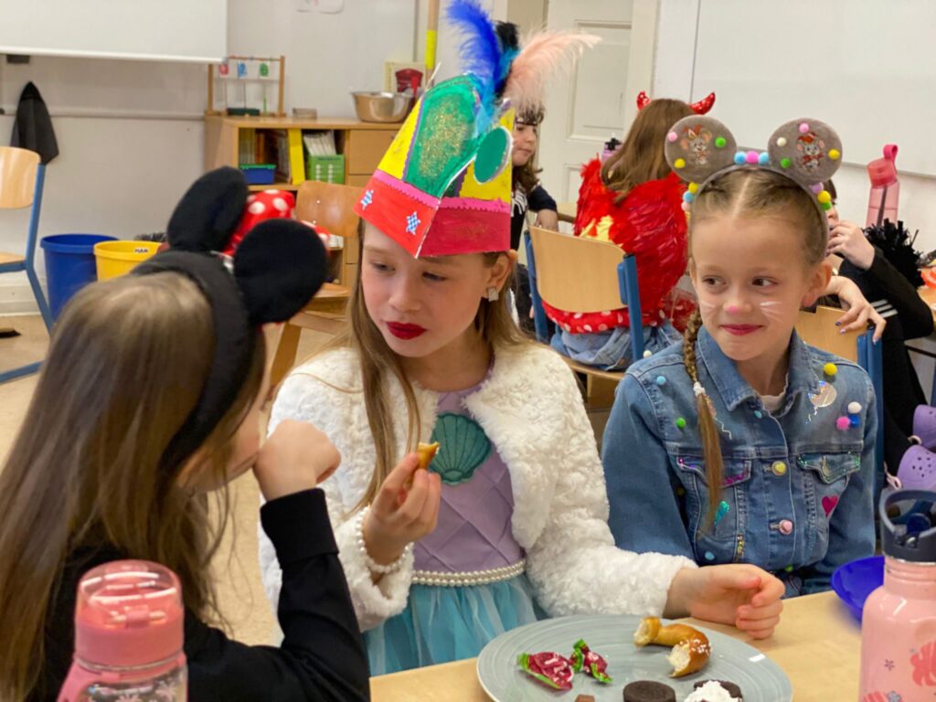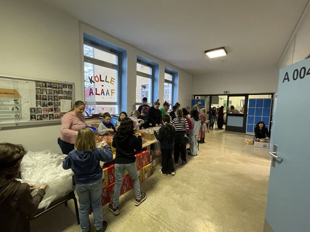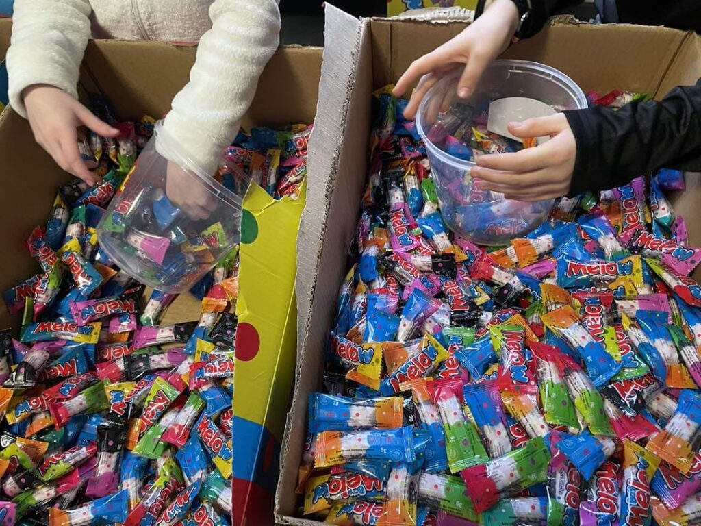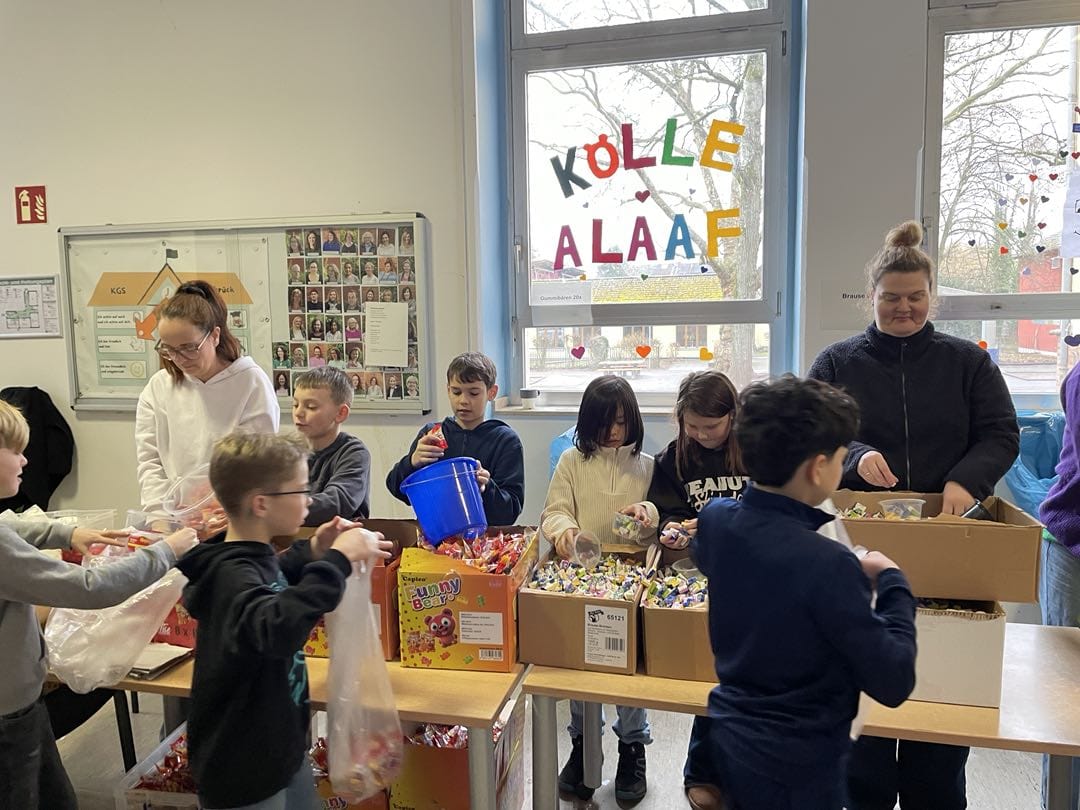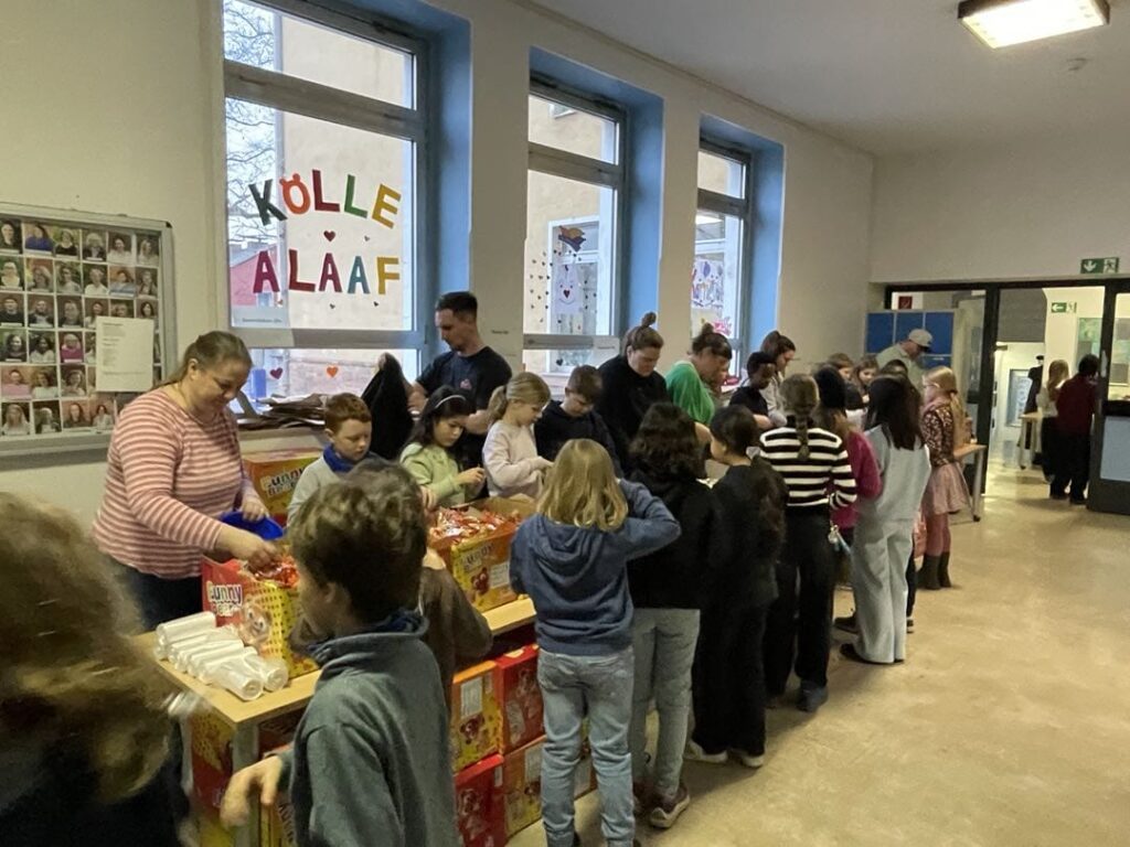 Am Dienstag zuvor hatten die Schülerinnen und Schüler der vier vierten Klassen an der Thurner Straße gemeinsam die 800 Kamellebüggel gepackt. Für die meisten ist es ein Höhepunkt ihres Abschlussjahres, wenn sie die Arbeitsstraßen entlanglaufen und die Beutel befüllen dürfen. Oder hinter den Tischen mit Gummibärchen, Brause oder Erdnussflips stehen und abzählen, wie viel sie an ihr jeweiliges Gegenüber abgeben, „zwei-vier-sechs-acht-zehn-zwölf-vierzehn-sechzehn-achtzehn-zwanzig“, murmelt ein Schüler immer und immer wieder vor sich her während er die Gummibärchen abzählt. Zwei Schulstunden lang. 80 bis 100 Teile Wurfmaterial gibt es pro Beutel, wie viele es genau pro Session sind, entscheidet der jeweilige Kamellepreis, fünf Euro kostet die Tüte diesmal.