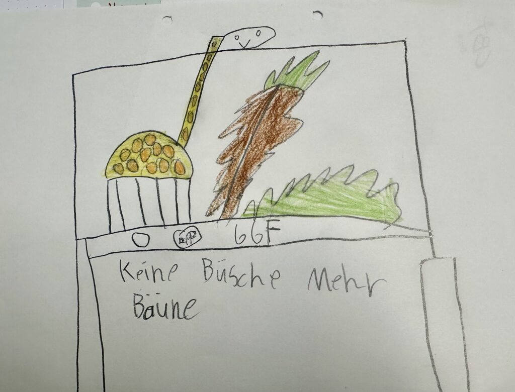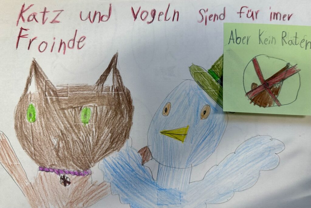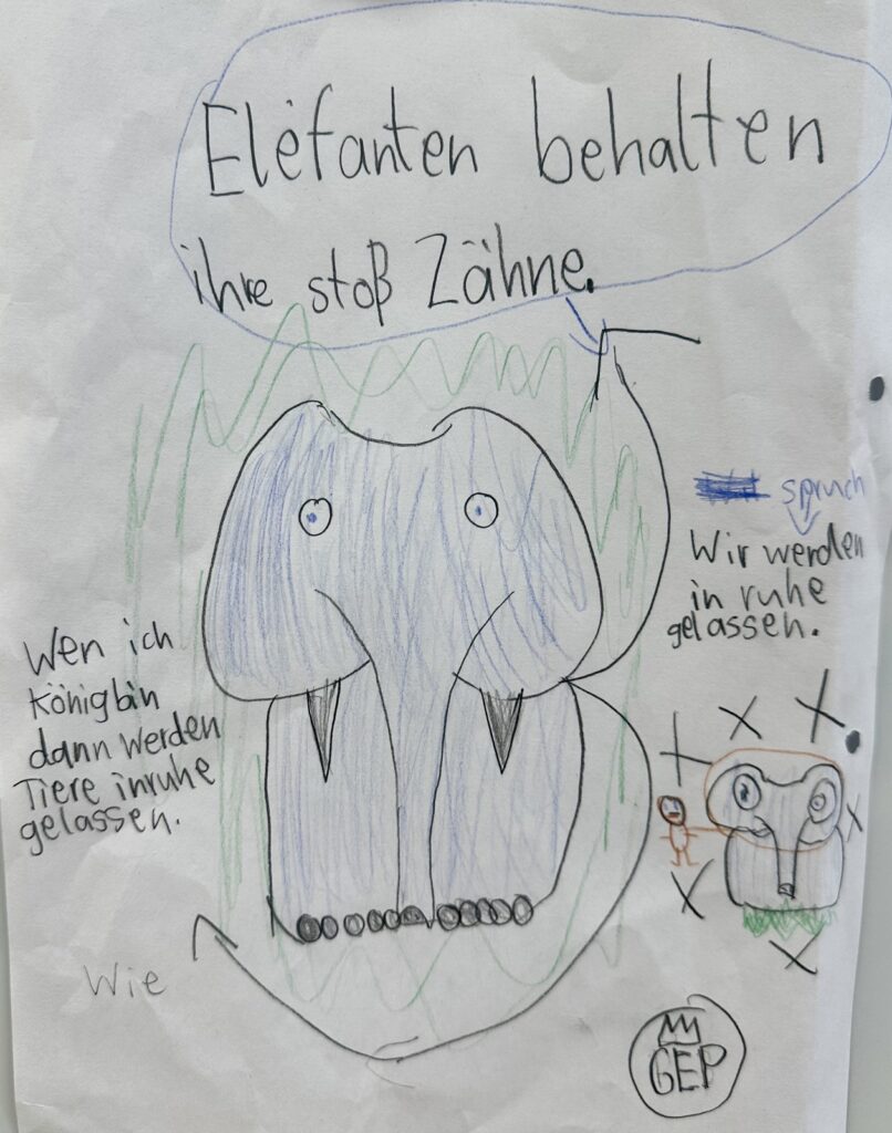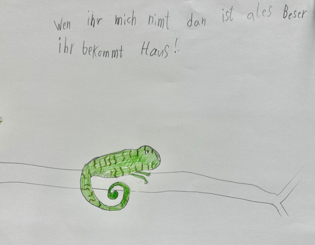 Dann haben wir eigene Wahlplakate gestaltet. Unsere Kandidaten waren Tiere, die wir mit bunten Bildern, lustigen Sprüchen und überzeugenden Ideen vorgestellt haben. Danach haben wir die Plakate gegenseitig präsentiert und kleine Wahlreden gehalten. Gemeinsam haben wir überlegt, ob die Sprüche und Argumente überzeugend waren und was eine gute Rede ausmacht.