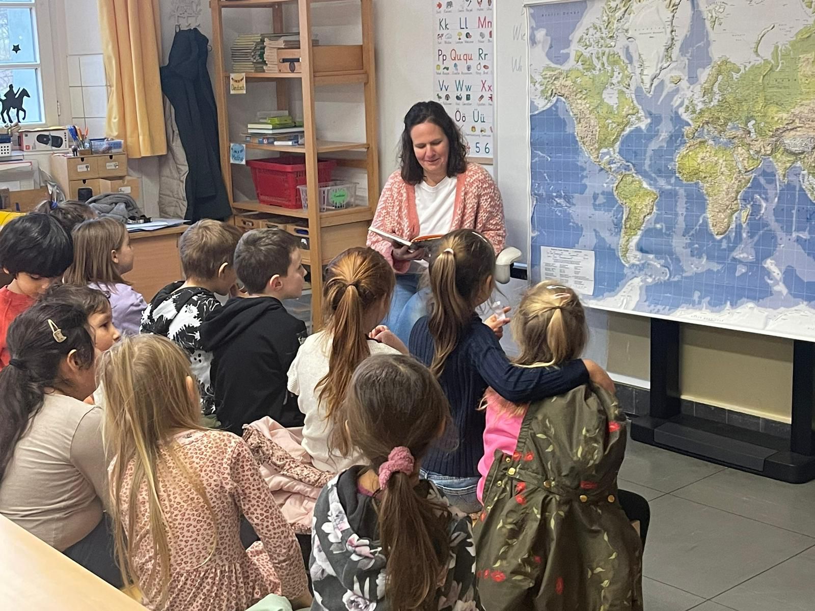 Am Vorlesetag haben wir uns alle auf dem Schulhof getroffen. Wir sind