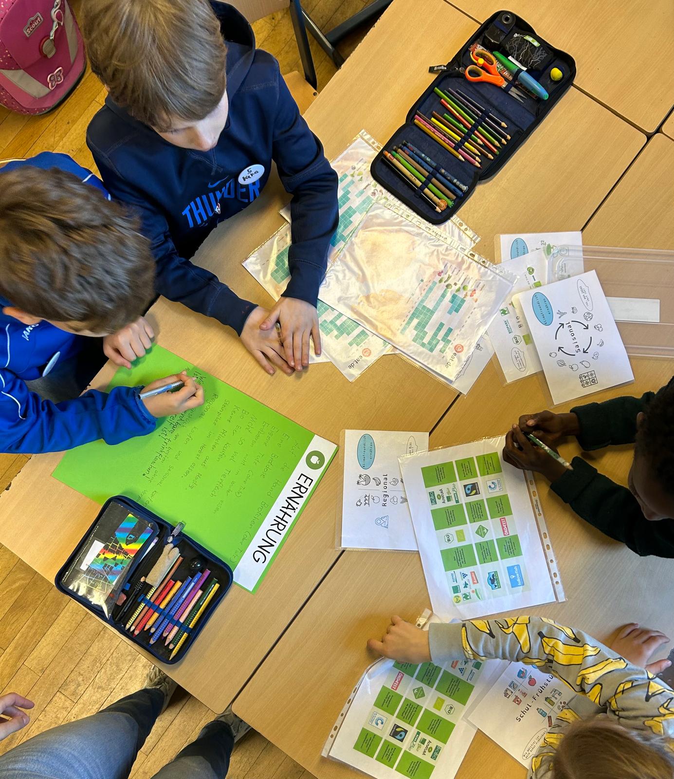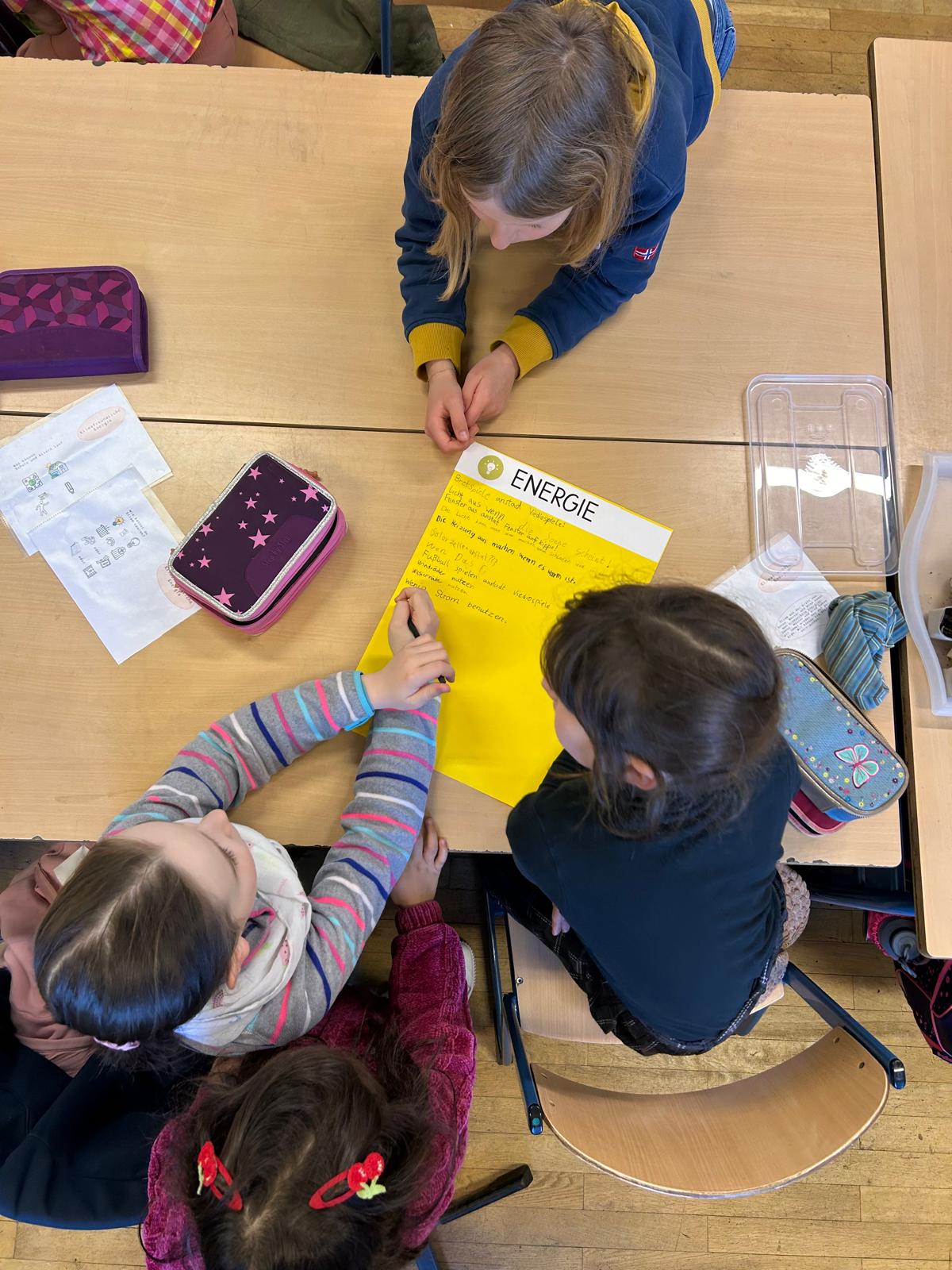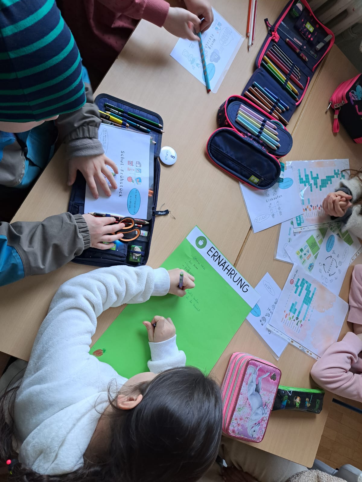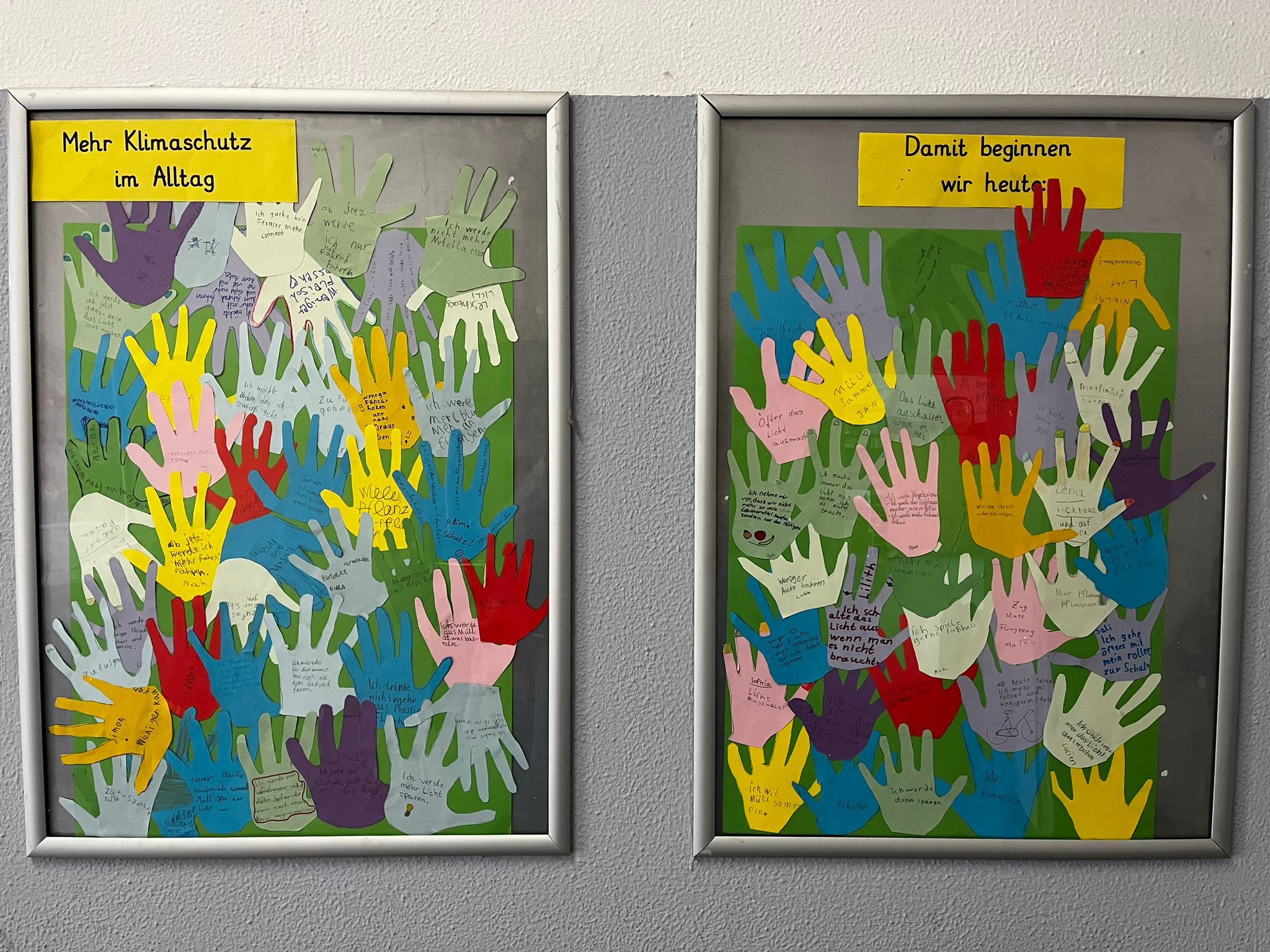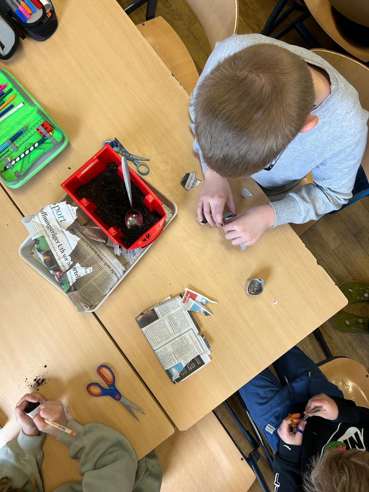 In einer Stationsarbeit haben wir überlegt, was wir in den verschiedenen Bereichen „Energie“, „Ernährung“, „Verkehr“ und „Müllvermeidung“ konkret tun können, um das Klima zu schützen. Eine dieser Maßnahmen haben wir dann direkt umgesetzt und kleine Anzuchttöpfchen gebastelt. Die Kinder konnten zwischen Sonnenblumen-, Zucchini- und Preisselbeersamen wählen. Ein Paar der bepflanzten Anzuchttöpfchen haben wir bei der Projektvorstellung am Ende der Woche für eine kleine Spenden an den „Bund für Umwelt und Naturschutz Deutschland gespendet“.