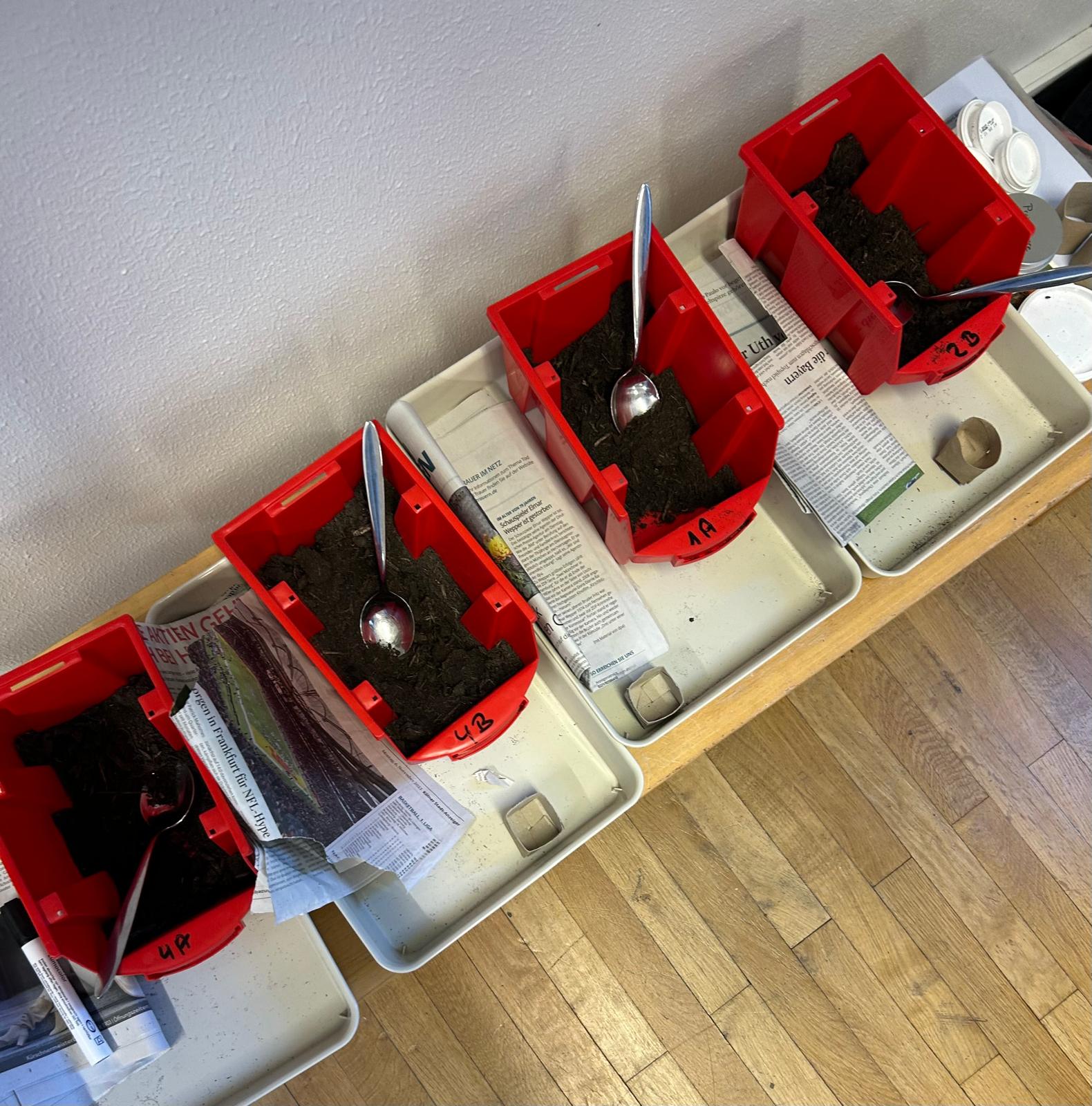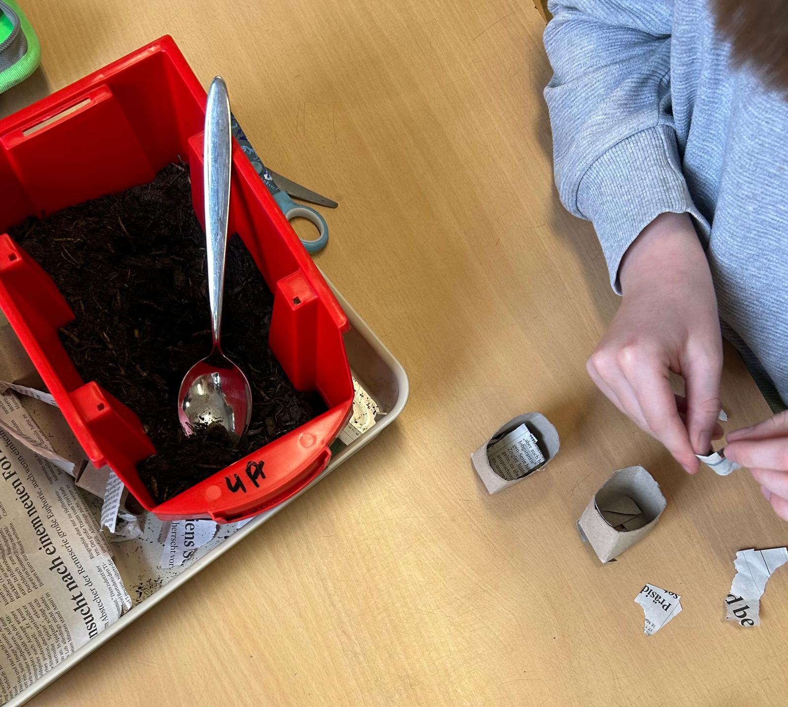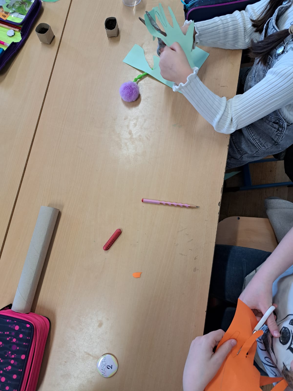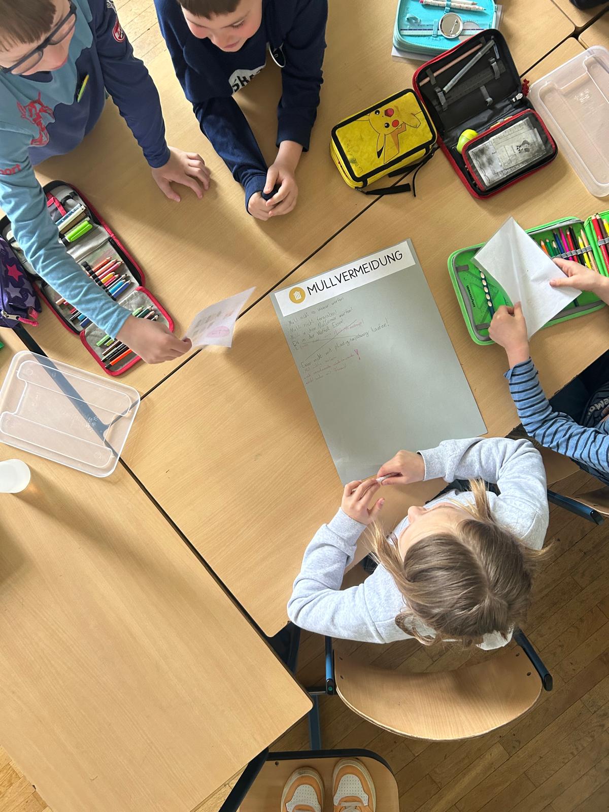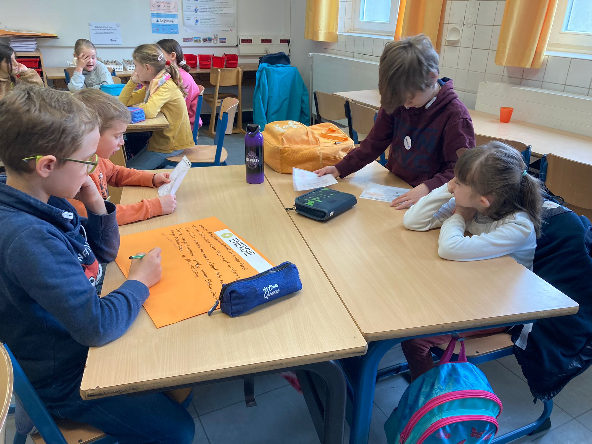In einer Stationsarbeit haben wir überlegt, was wir in den verschiedenen Bereichen „Energie“, „Ernährung“, „Verkehr“ und „Müllvermeidung“ konkret tun können, um das Klima zu schützen. Eine dieser Maßnahmen haben wir dann direkt umgesetzt und kleine Anzuchttöpfchen gebastelt. Die Kinder konnten zwischen Sonnenblumen-, Zucchini- und Preisselbeersamen wählen. Ein Paar der bepflanzten Anzuchttöpfchen haben wir bei der Projektvorstellung am Ende der Woche für eine kleine Spenden an den „Bund für Umwelt und Naturschutz Deutschland gespendet“.