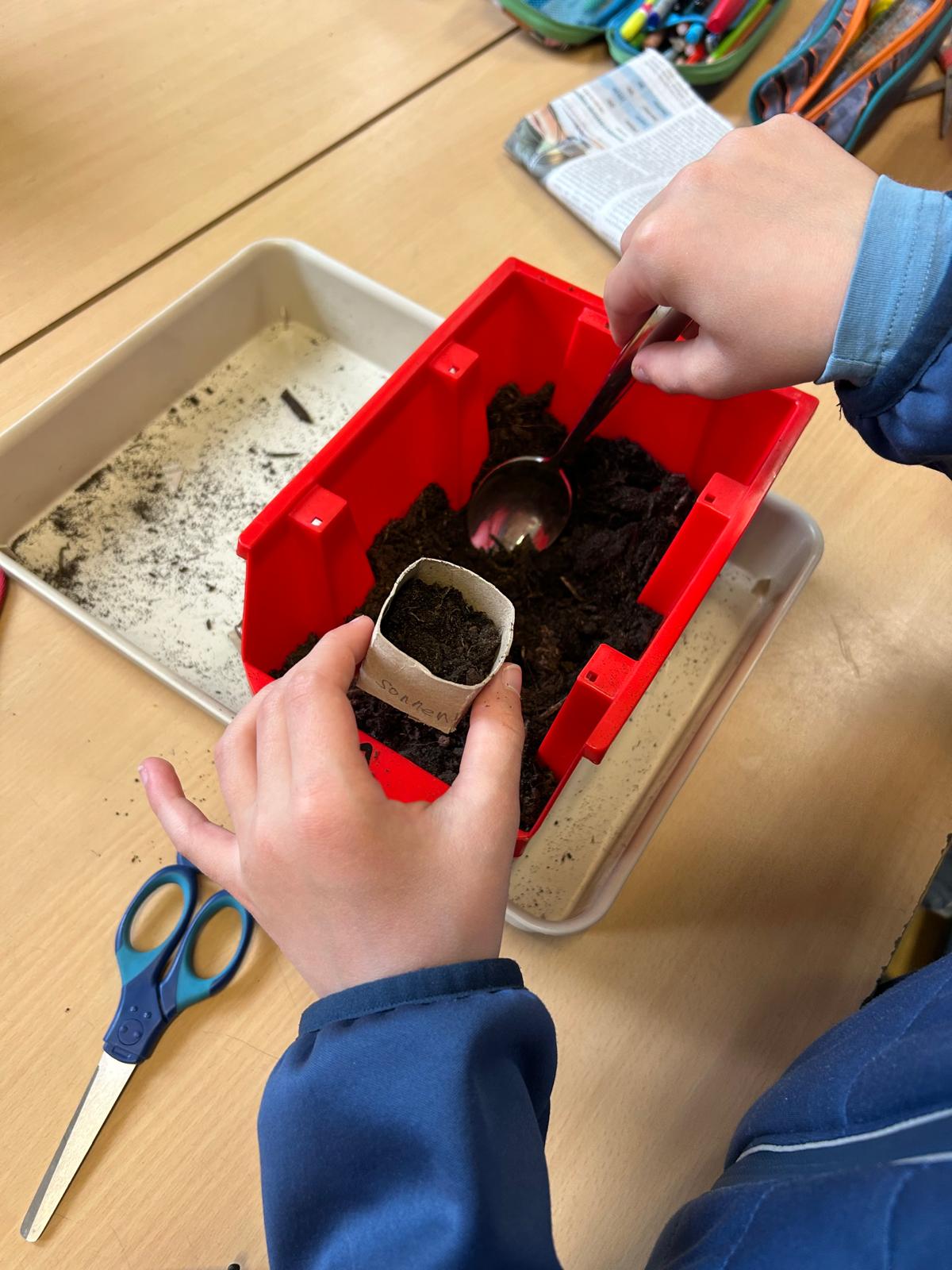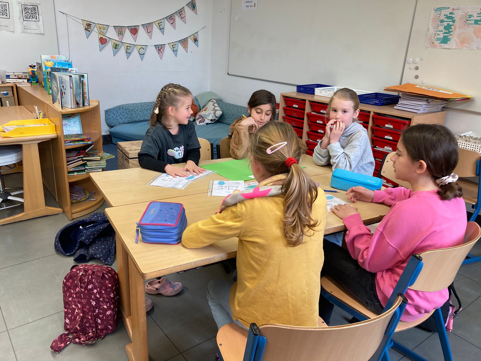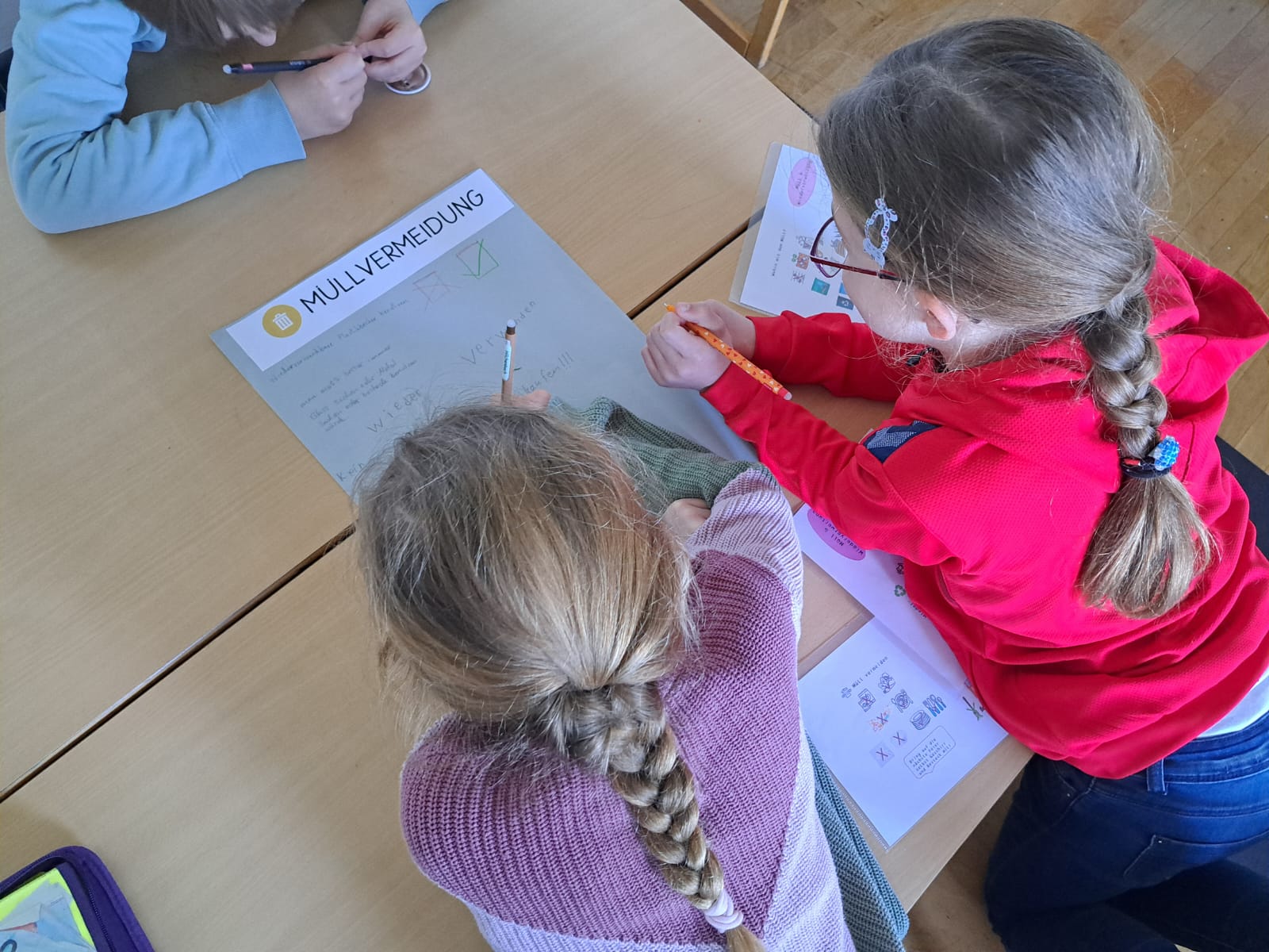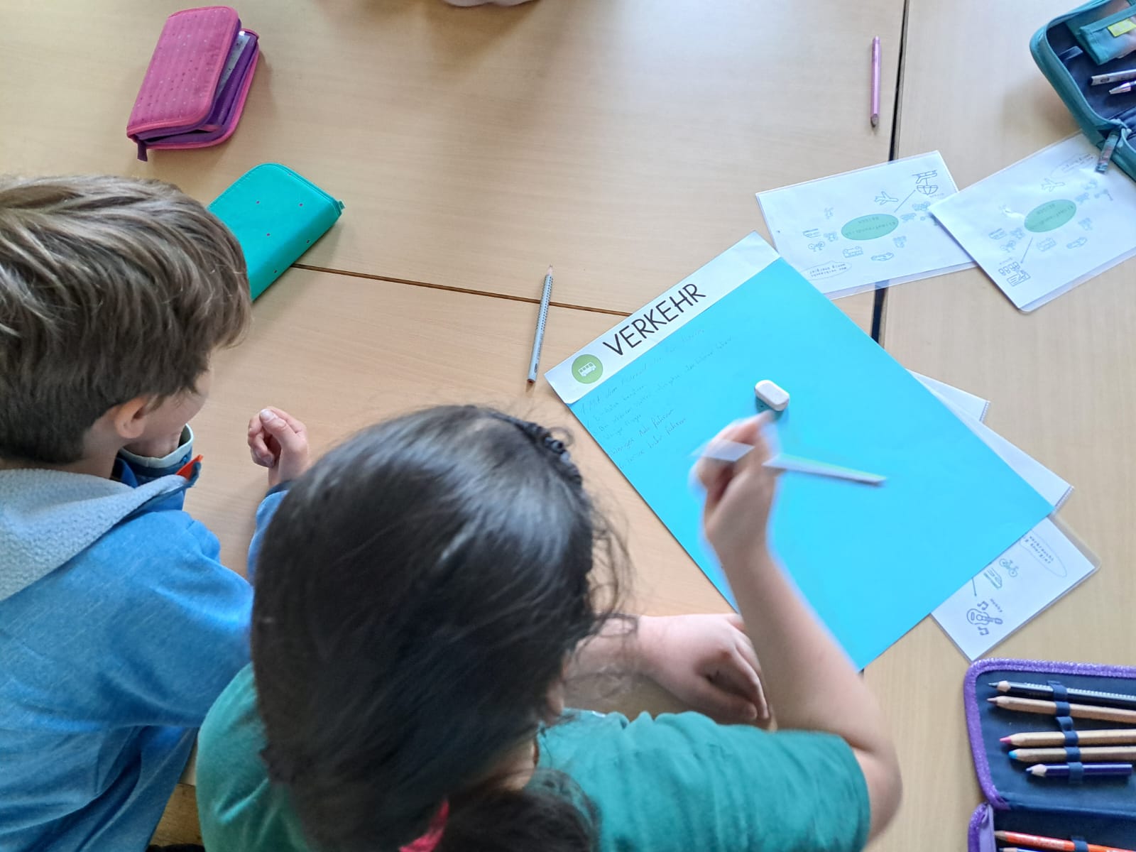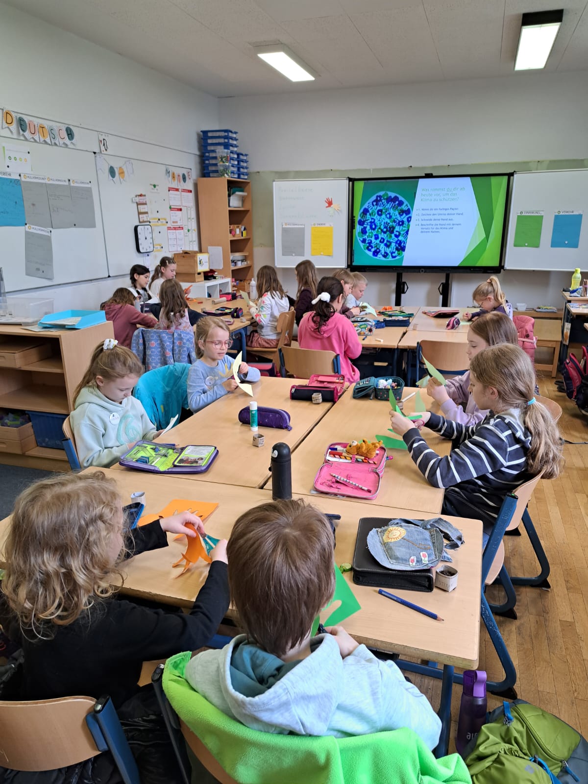 In einer Stationsarbeit haben wir überlegt, was wir in den verschiedenen Bereichen „Energie“, „Ernährung“, „Verkehr“ und „Müllvermeidung“ konkret tun können, um das Klima zu schützen. Eine dieser Maßnahmen haben wir dann direkt umgesetzt und kleine Anzuchttöpfchen gebastelt. Die Kinder konnten zwischen Sonnenblumen-, Zucchini- und Preisselbeersamen wählen. Ein Paar der bepflanzten Anzuchttöpfchen haben wir bei der Projektvorstellung am Ende der Woche für eine kleine Spenden an den „Bund für Umwelt und Naturschutz Deutschland gespendet“.