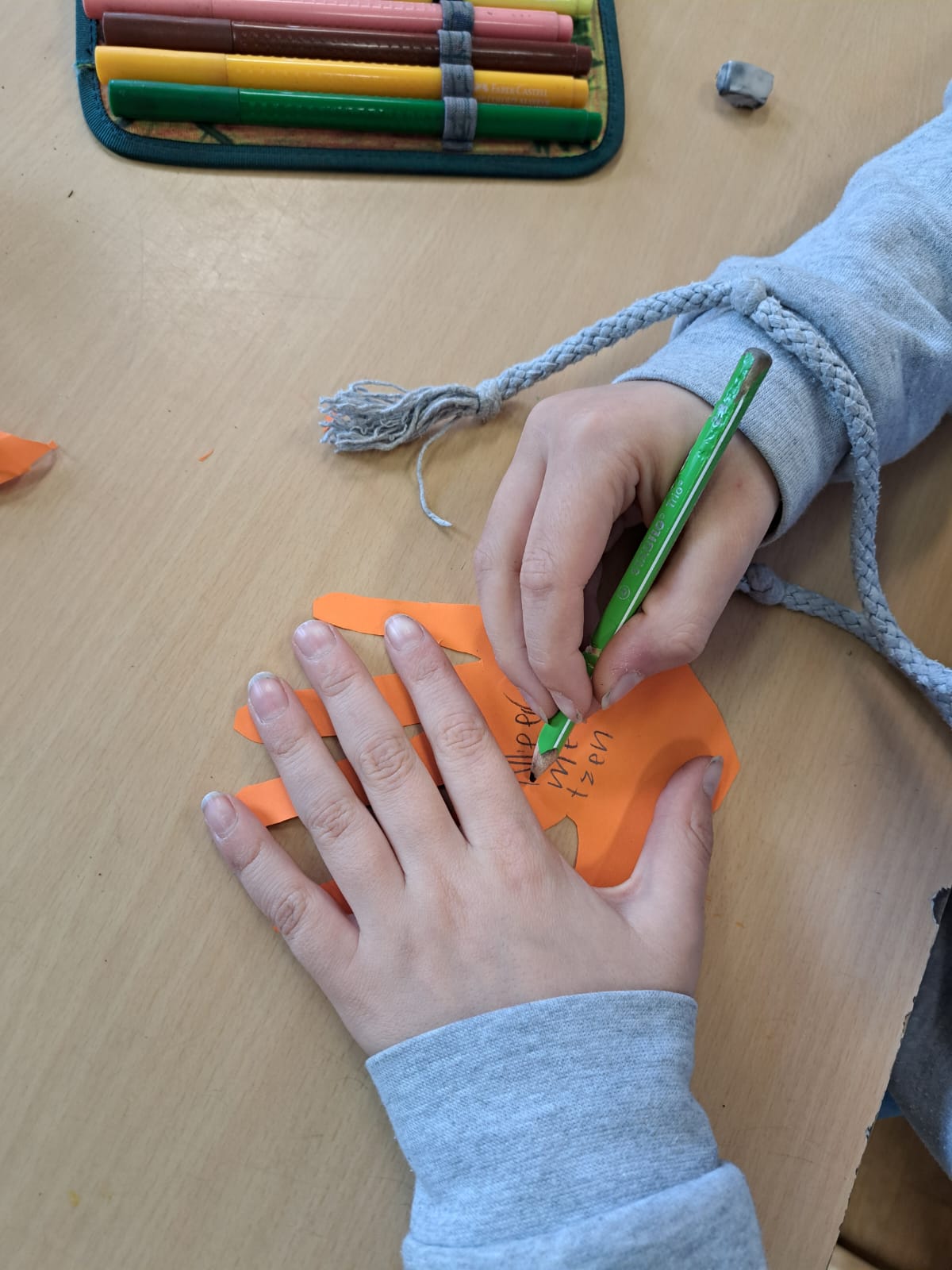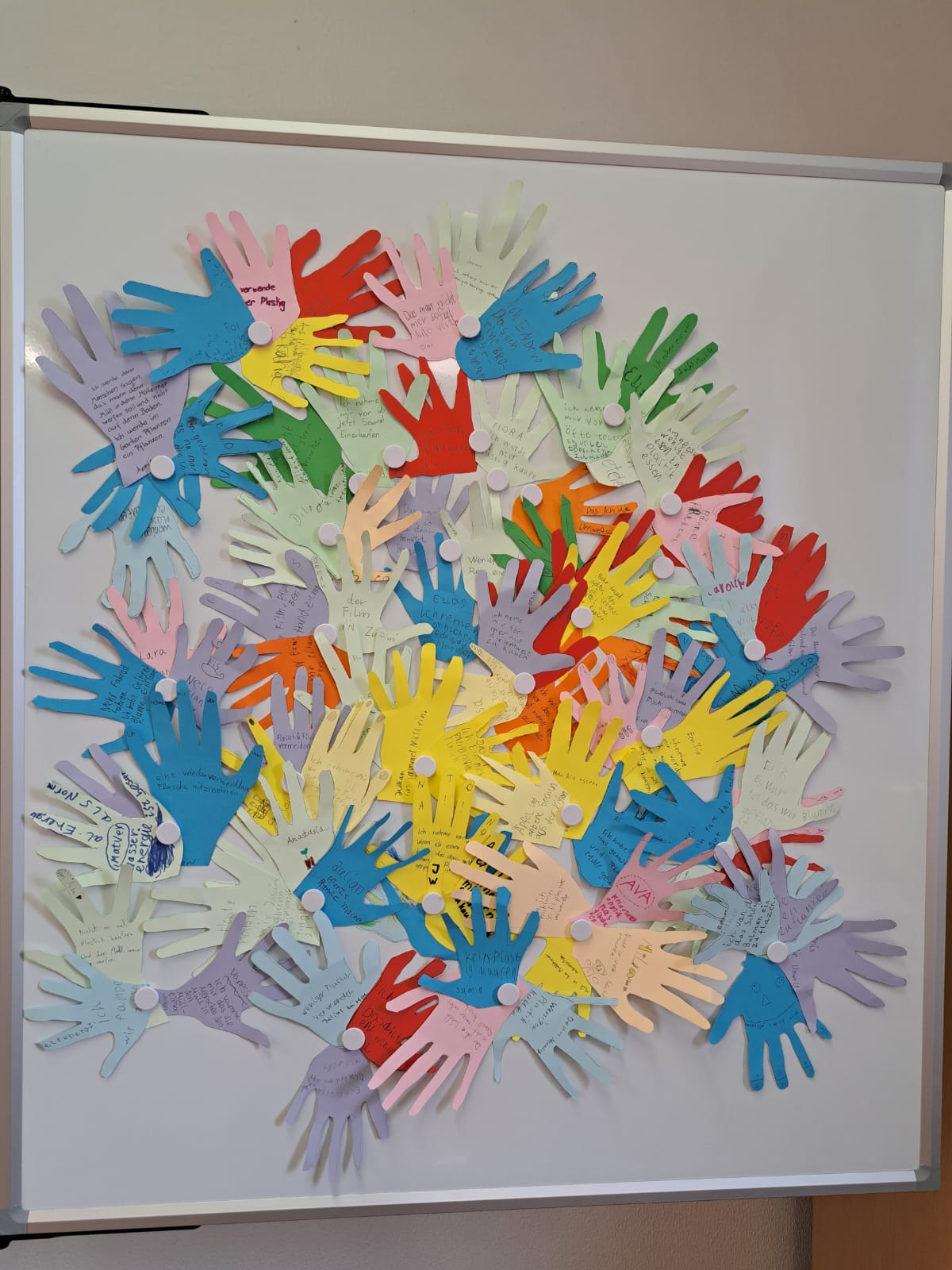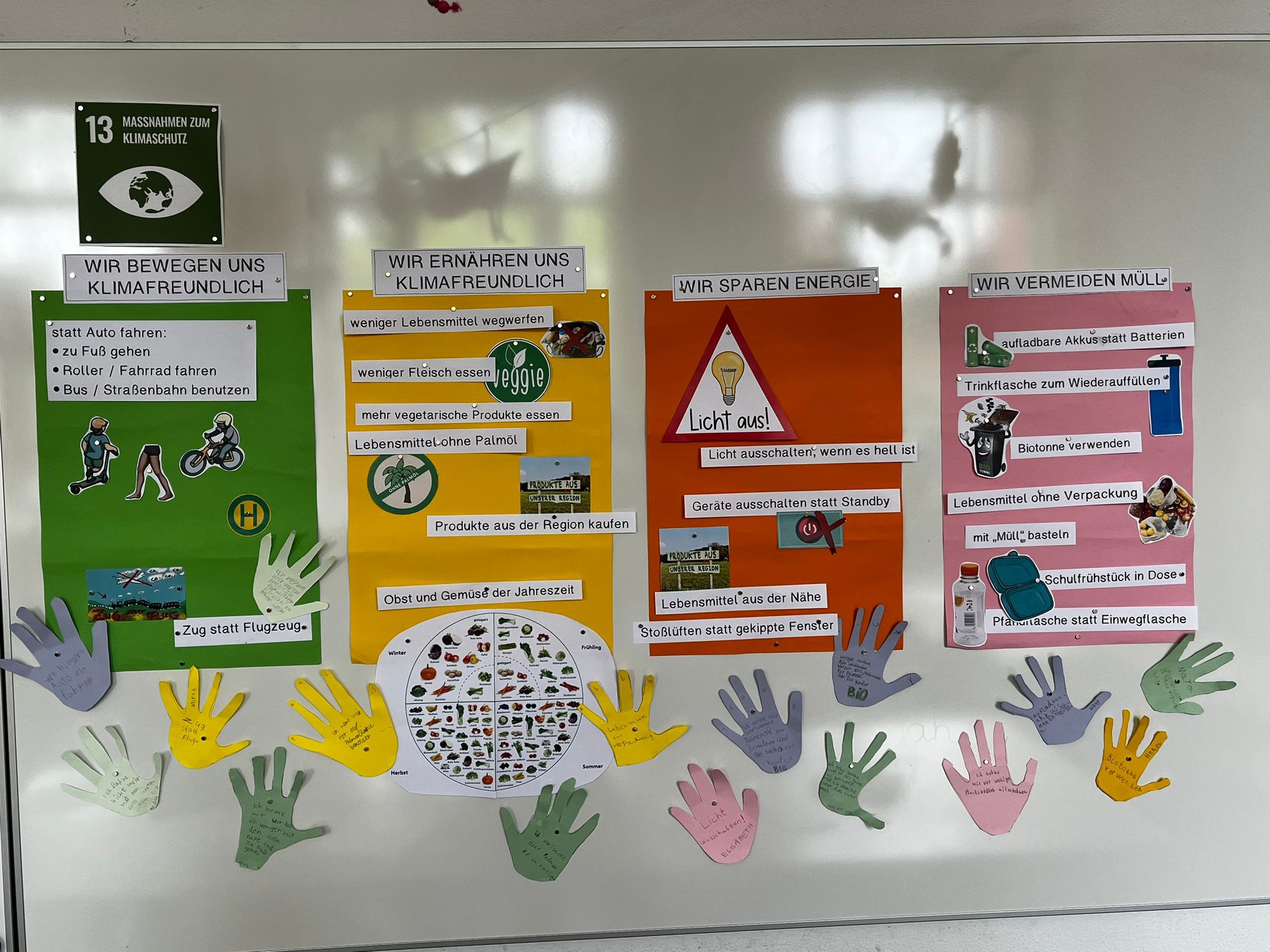 Zum Schluss hat jedes Kind auf seinen Handumriss geschrieben, was es sich konkret vornimmt. Die Plakate mit den guten Vorsätzen hängen nun für jedes Kind sichtbar im Eingangsbereich unserer Schule.